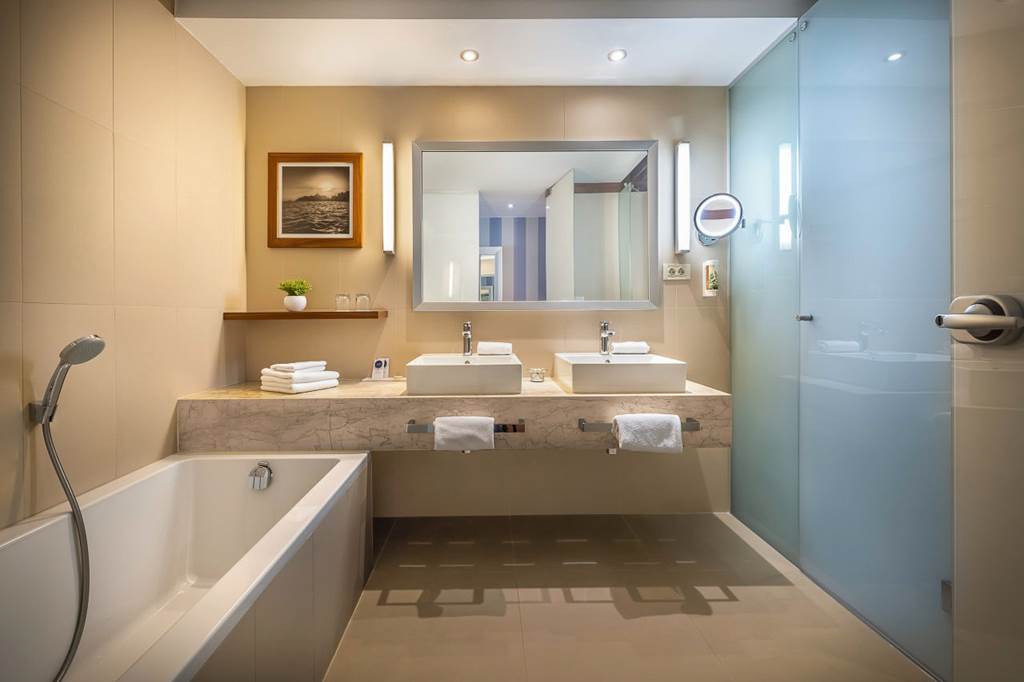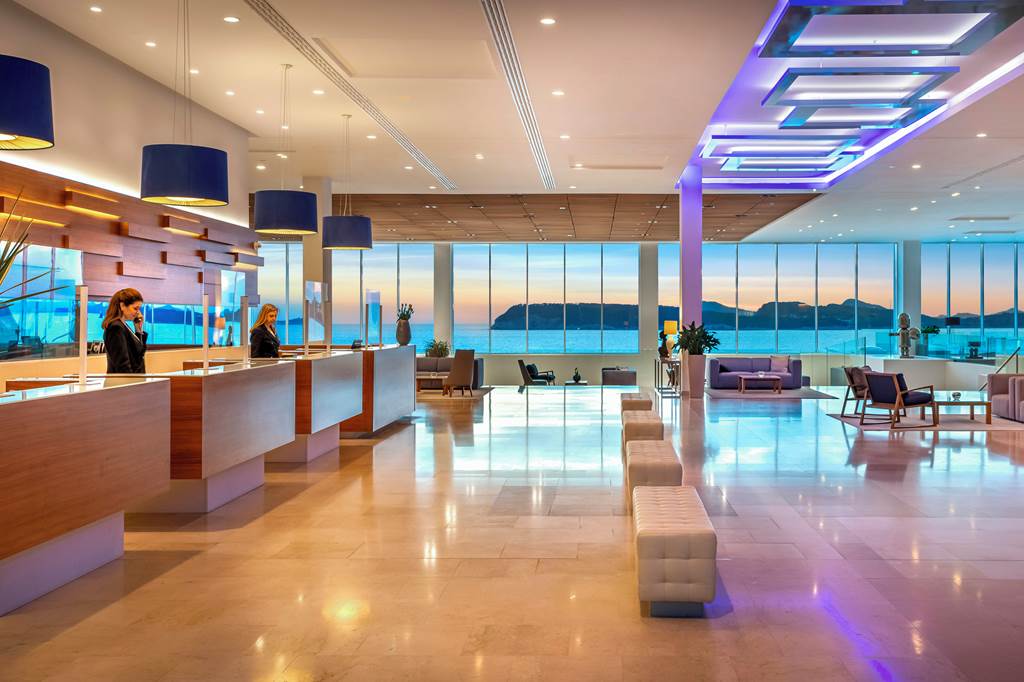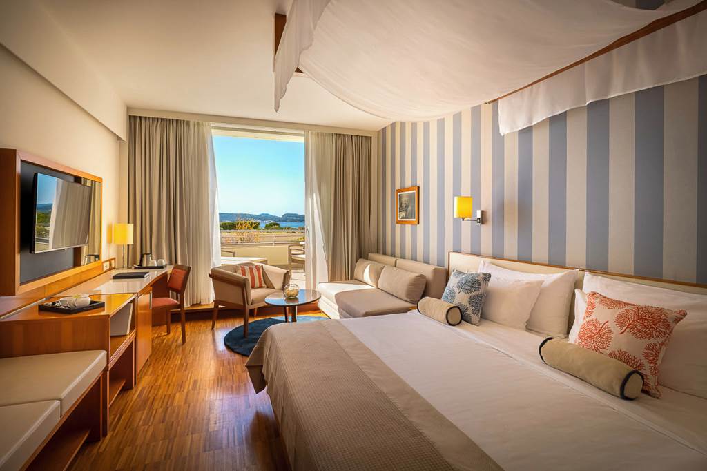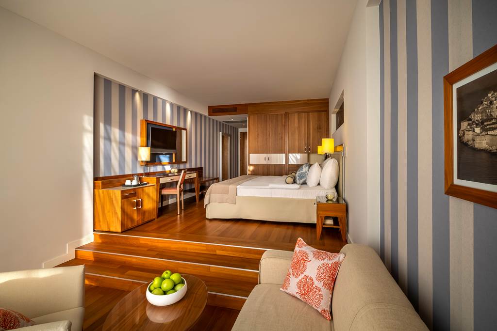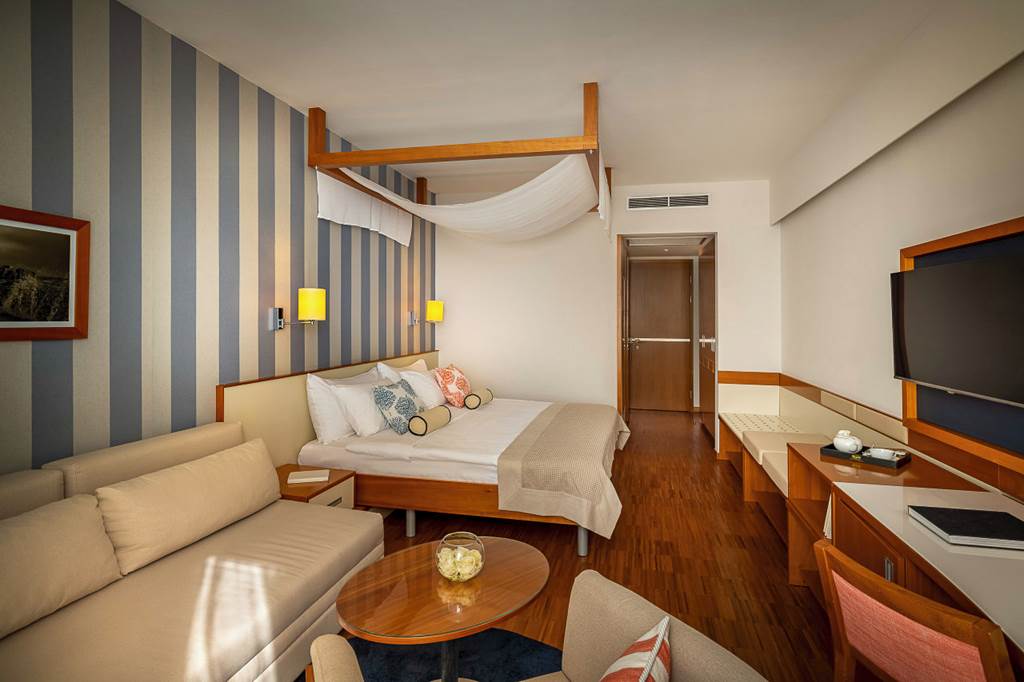 Double and Twin rooms sleep up to 3 adults or 2 adults and 1 child and have sea views and a full bathroom, hairdryer, air conditioning, flat screen satellite TV, pillow choice, hospitality tray, free Wi-Fi and a large balcony with sun loungers offering sea views. Superior rooms are larger and are on the higher floors and so offer clearer sea views.