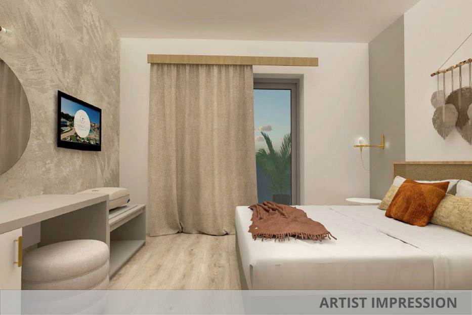 Garden view rooms sleep 2 adults in a double or twin beds and have air-conditioning (15 Jun - 15 Sept), TV, hairdryer, full bathroom and balcony or terrace. Family rooms with bunk beds sleeping 2 adults and 2 children, Family rooms with a separate room sleeping 3 adults and 1 child or 2 adults and 2 children, Pool view rooms and Single rooms are also available.