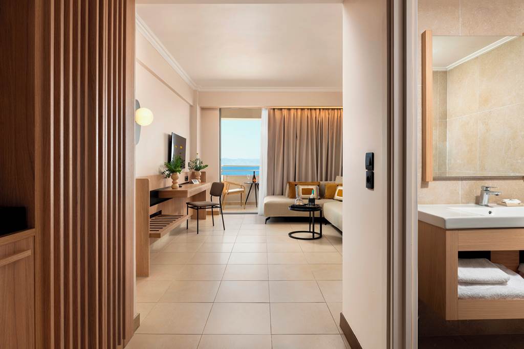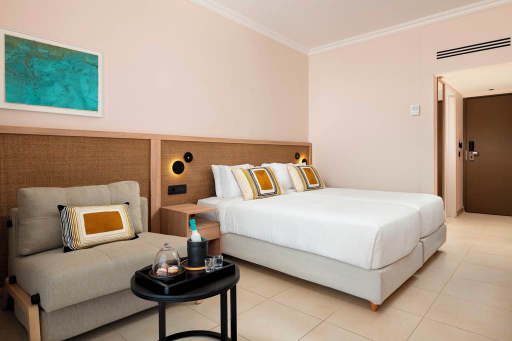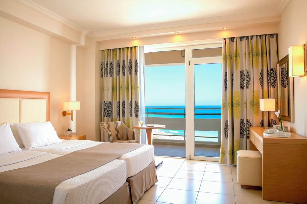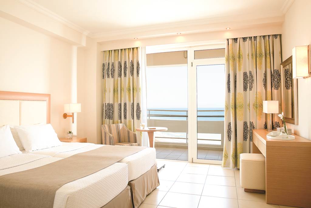 Standard rooms sleep up to 3 adults or 2 adults and 1 child and have a bathroom containing bath, hairdryer, bathrobe and slippers, air conditioning (15 May-15 Sep), flat screen television, tea and coffee making facilities and balcony. Standard room with Sea view, Superior Sea Front room sleeping up to 2 adults, Junior suites sleeping up to 4 adults (open plan) and Family suites sleeping up to 4 adults are also available.