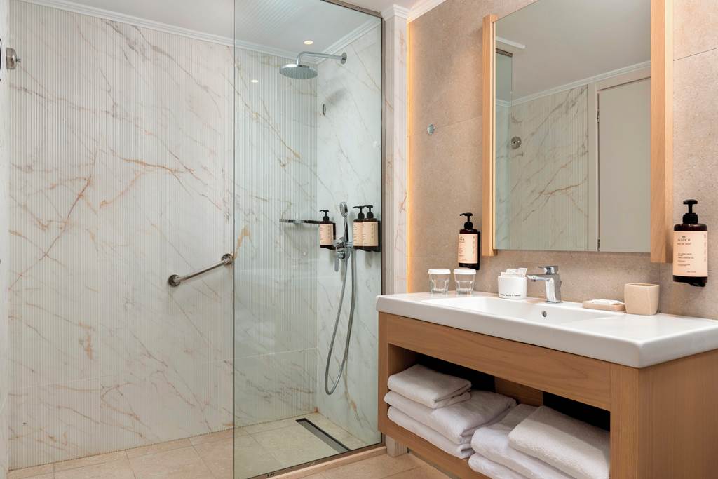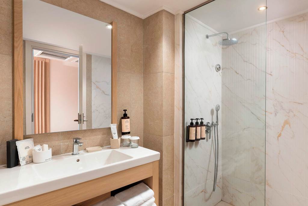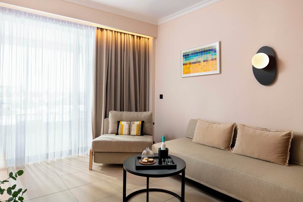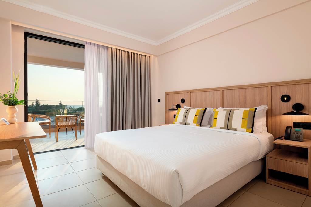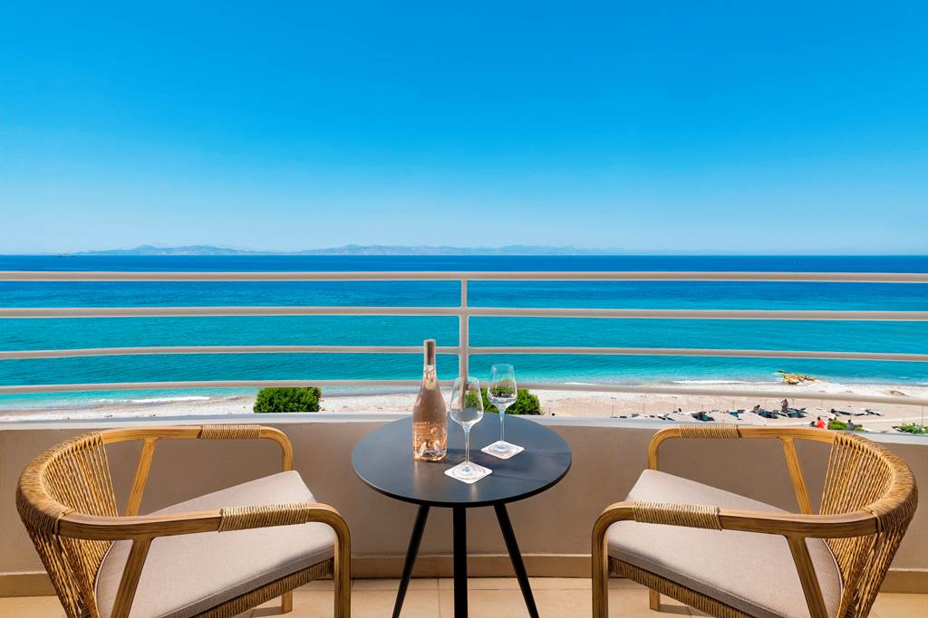 Standard rooms sleep up to 3 adults or 2 adults and 1 child and have a bathroom containing bath, hairdryer, bathrobe and slippers, air conditioning (15 May-15 Sep), flat screen television, tea and coffee making facilities and balcony. Standard room with Sea view, Superior Sea Front room sleeping up to 2 adults, Junior suites sleeping up to 4 adults (open plan) and Family suites sleeping up to 4 adults are also available.