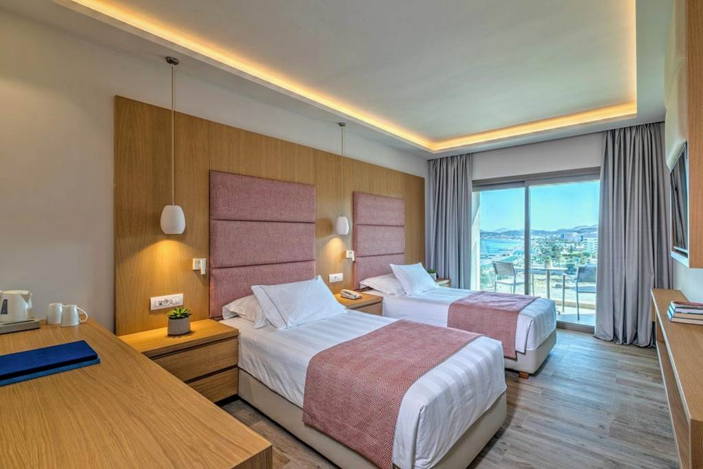 Double rooms with Mountain View sleeps to 3 adults and have bathroom containing a bath or shower, air conditioning, hairdryer, bathrobe and slippers, flat screen television, fridge, tea and coffee making facilities and balcony or terrace. Double rooms with Sea View and Two Bedroom suites with Sea View sleeping up to 4 adults are also available.