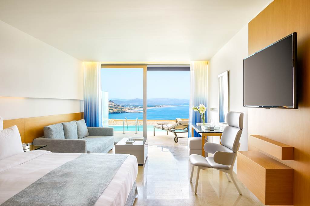 Sea view rooms have air-conditioning, flatscreen TV, DVD and MP3 player, mini-bar*, bathroom with whirlpool bath and separate shower, bathrobes and slippers and balcony or terrace with sea view. Junior suites with sitting area and larger balcony, Deluxe room with outdoor whirlpool, Junior suites with shared pool, Villas with Private Pool and Maisonettes with Private Pool are also available.