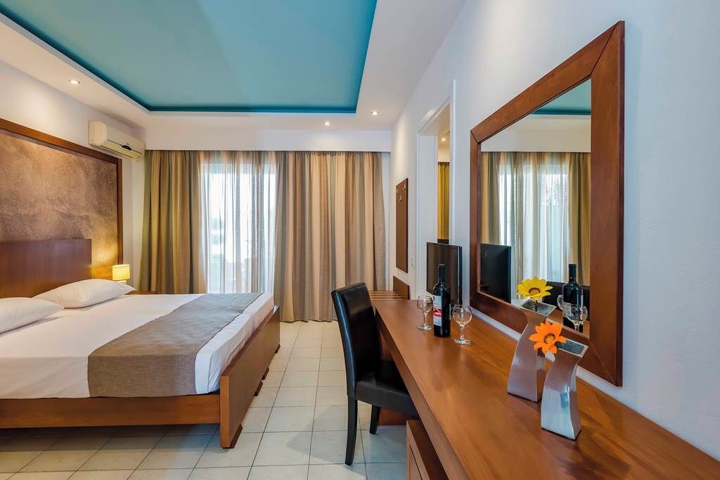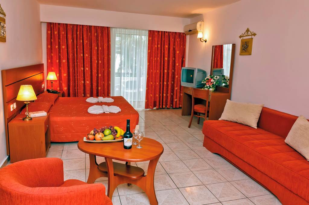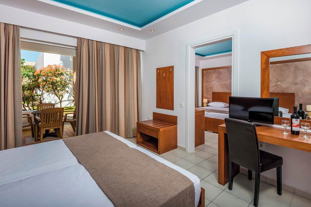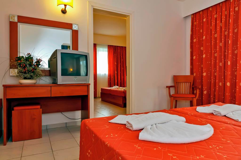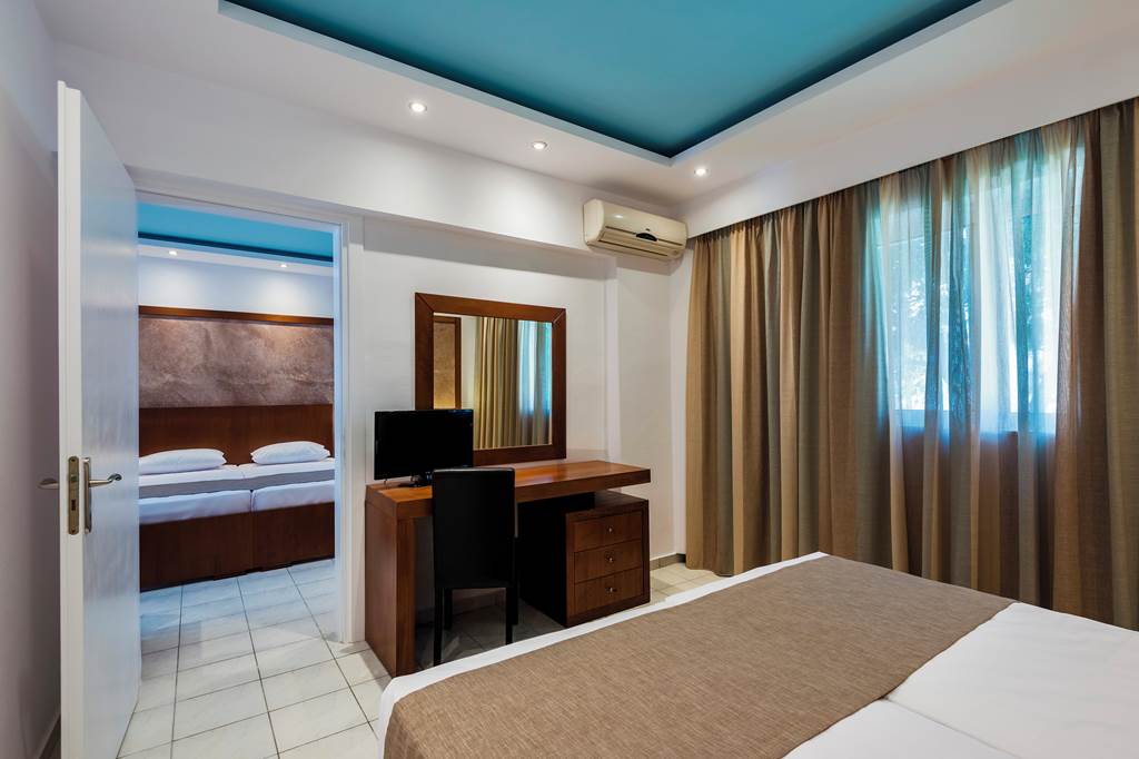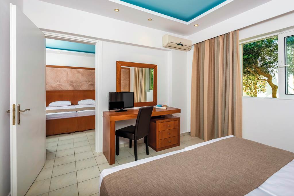 Double and twin rooms sleep up to 3 adults and have bathroom containing a bath, air conditioning, hairdryer, television and balcony or terrace. Family rooms and single rooms are also available.