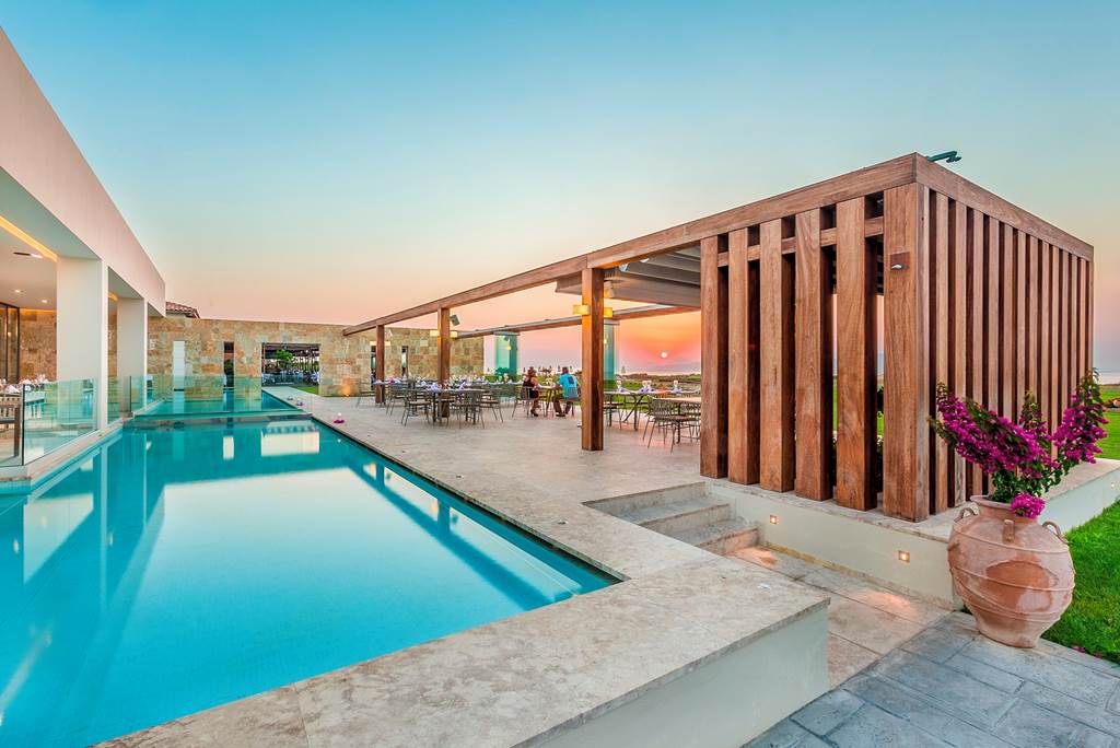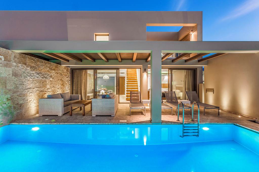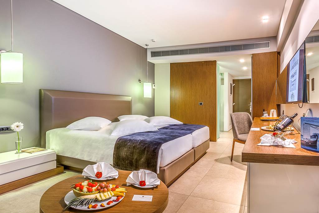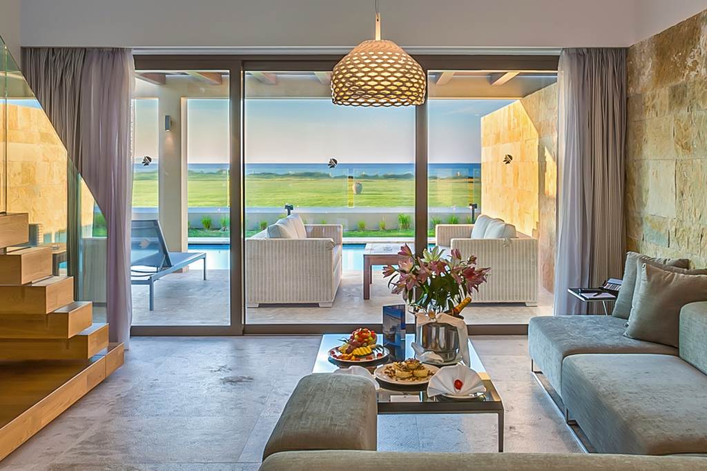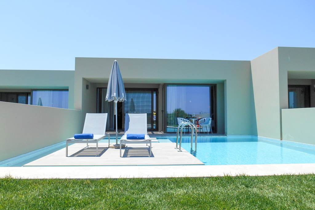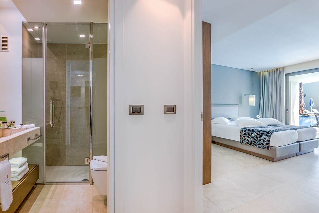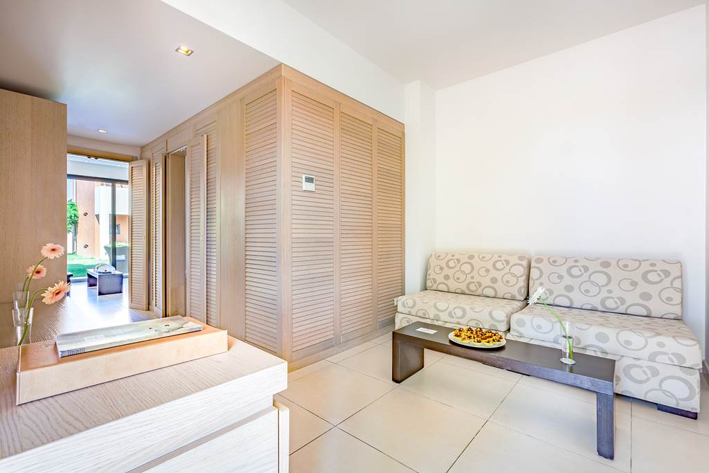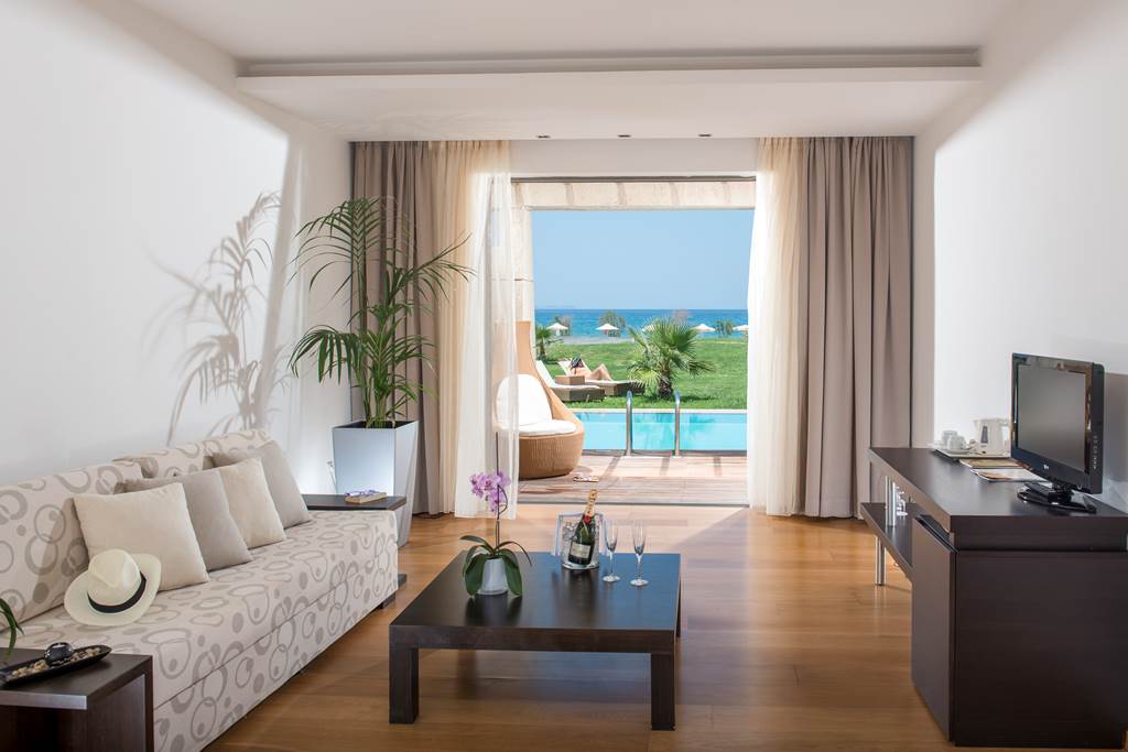 Double and Twin rooms sleep up to 3 adults and have bathroom containing a bath or shower, air conditioning, hairdryer, bathrobes and slippers, flat screen television, tea and coffee making facilities and balcony or terrace. Double and Twin rooms with Sea View, Double and Twin rooms with shared Pool, One Bedroom Family room, Executive suite with Private Pool and Sea Front maisonette with Shared Pool are also available.