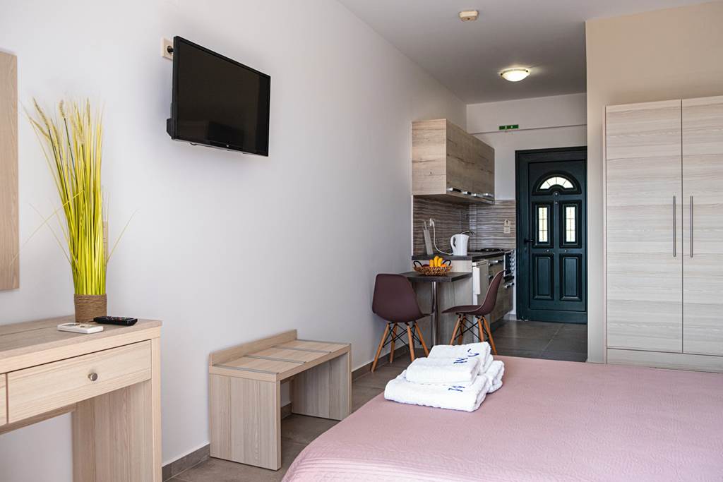 Studios sleep up to 3 adults and have bathroom containing a shower, air conditioning*, flat screen television, fridge, kettle, double cooking rings and shared balcony or terrace.
