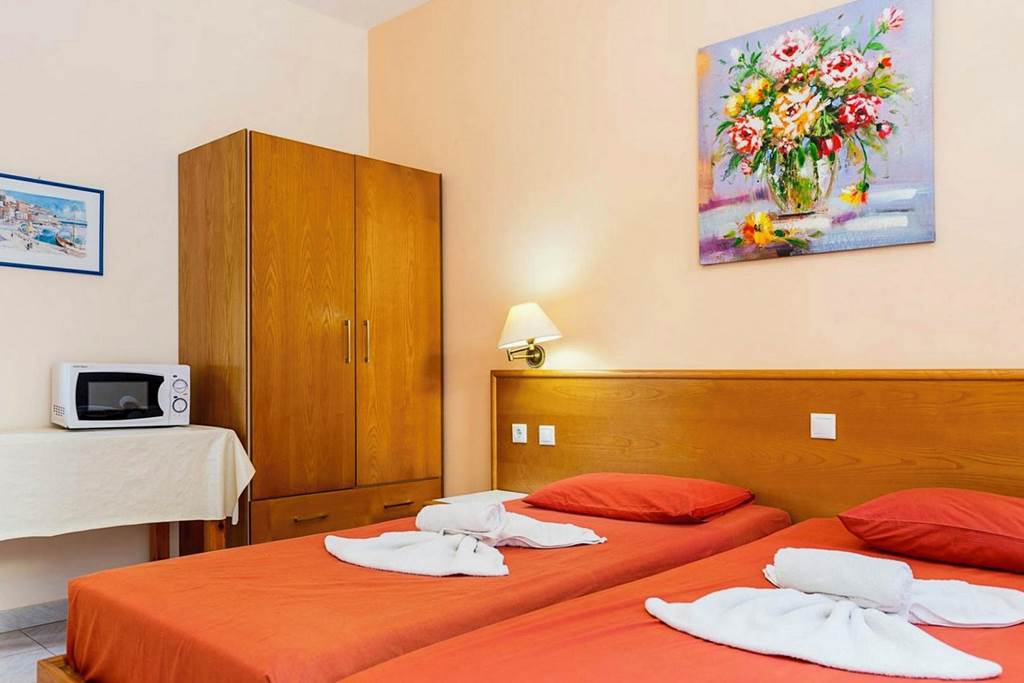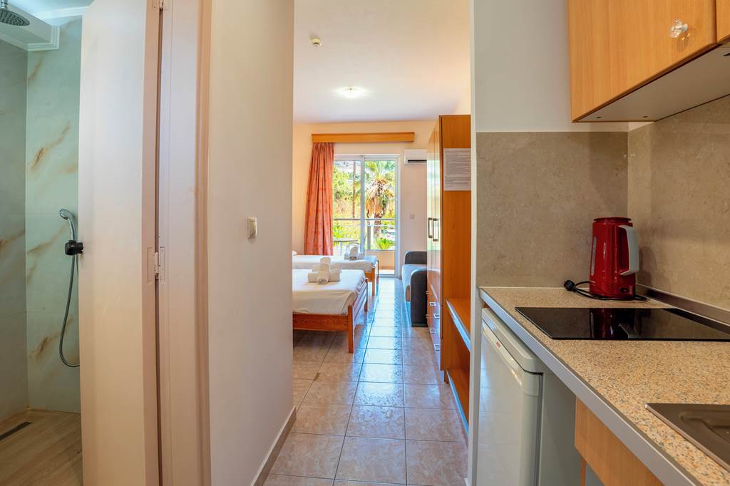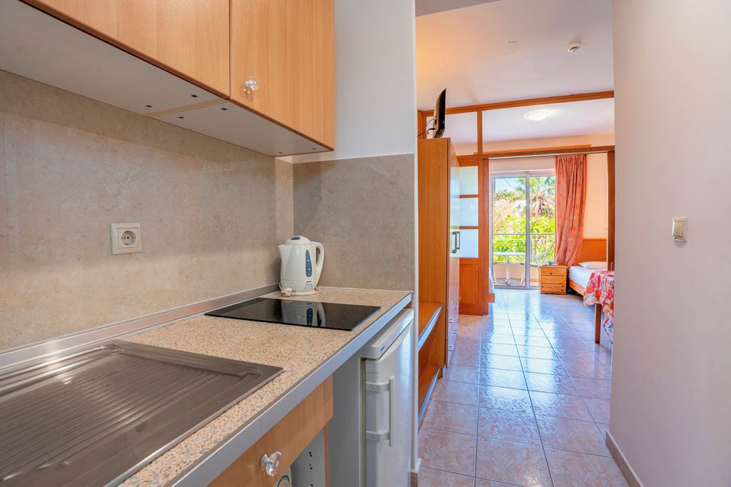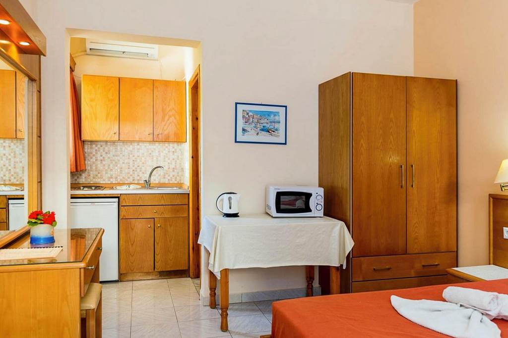 Studios sleep up to 2 adults and have bathroom containing a bath or shower, air conditioning*, hairdryer, double cooking rings, fridge, kettle, microwave, and a balcony or terrace.