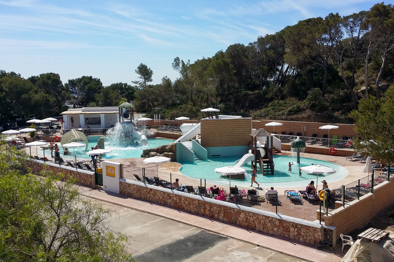 Large outdoor swimming pool with a separate children?s section. Kids Splashpark.Transfer Time