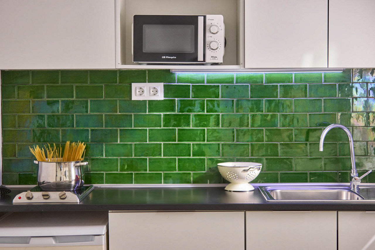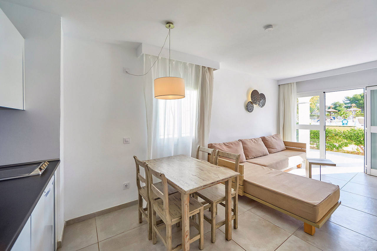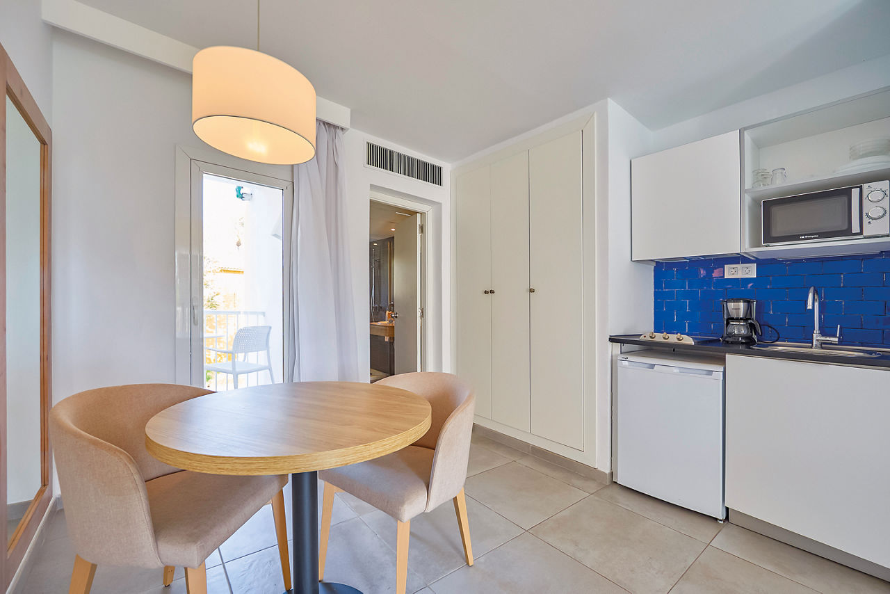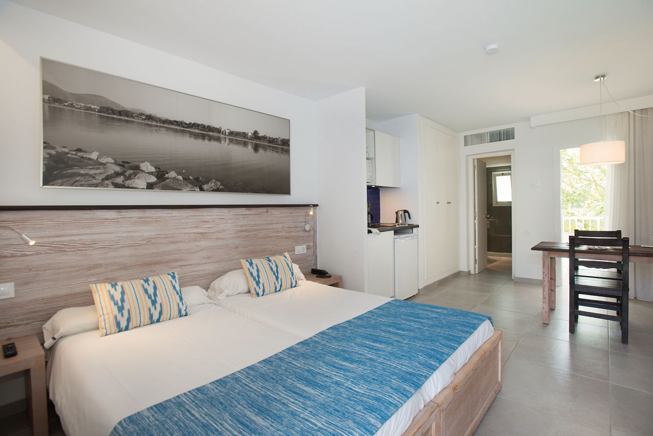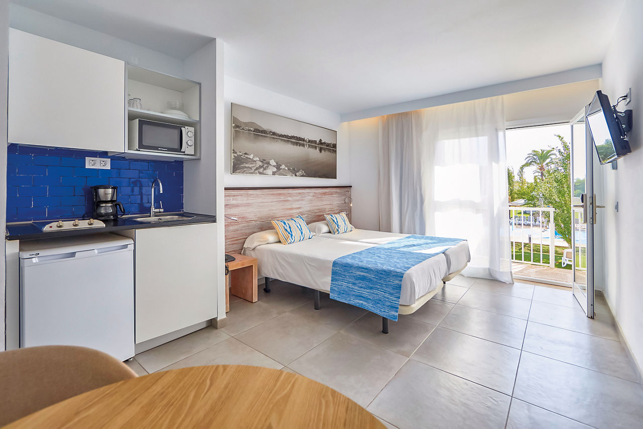 Studios sleep 2 adults have full bathroom, air-conditioning, television, kitchenette with microwave, kettle, toaster, hairdryer and terrace. One Bedroom apartment sleeping up to 4 adults and Two Bedroom apartments are also available.