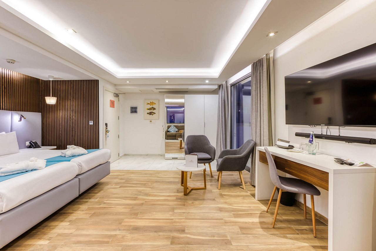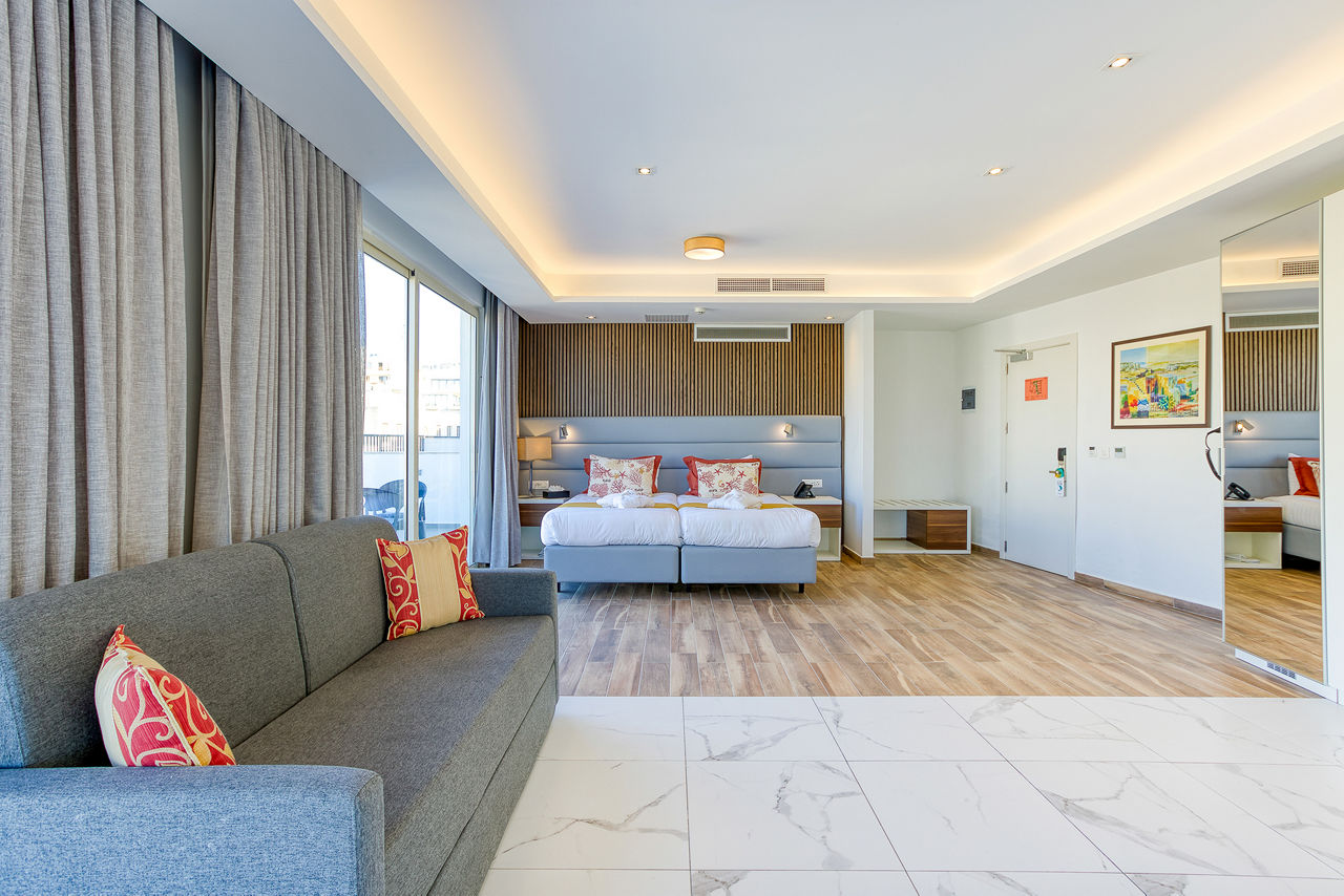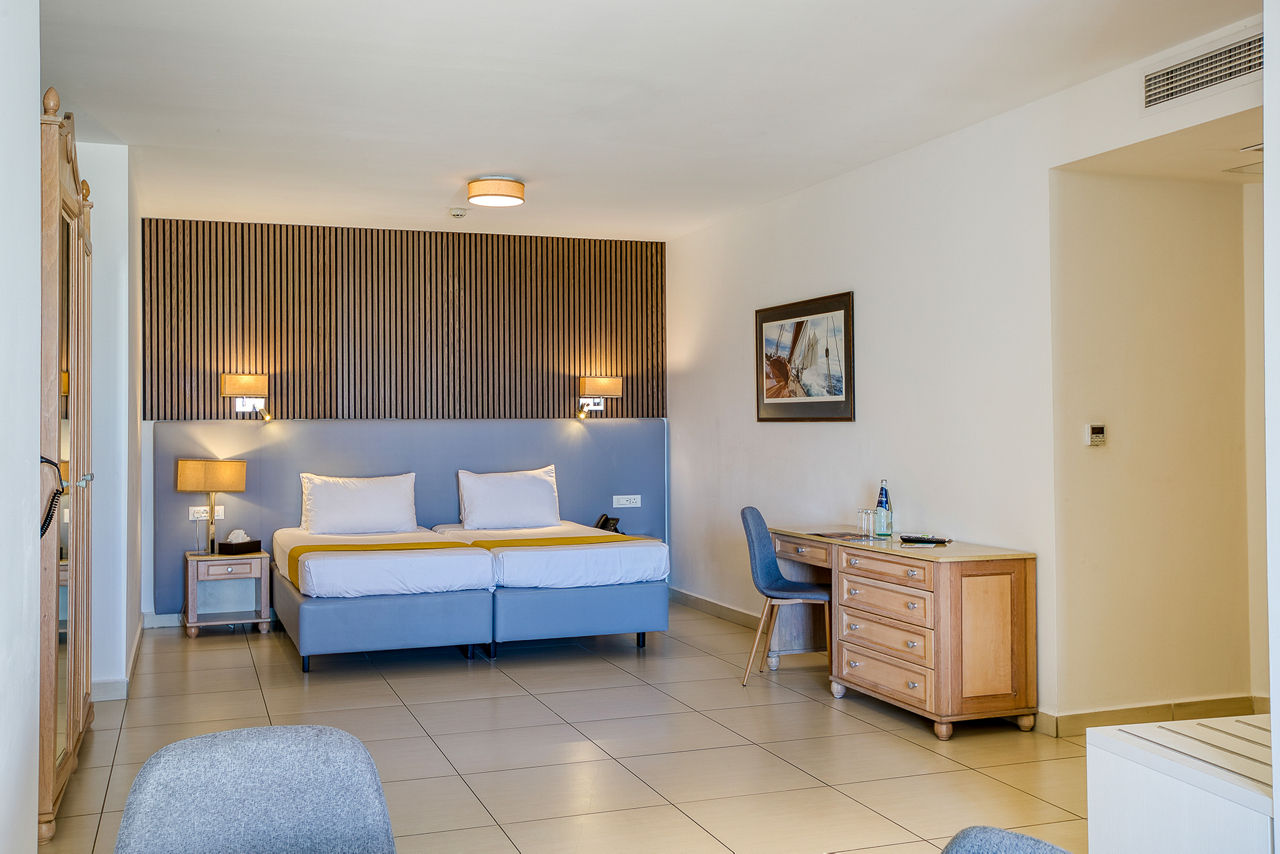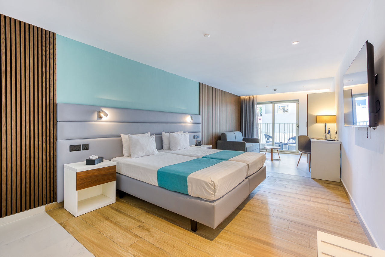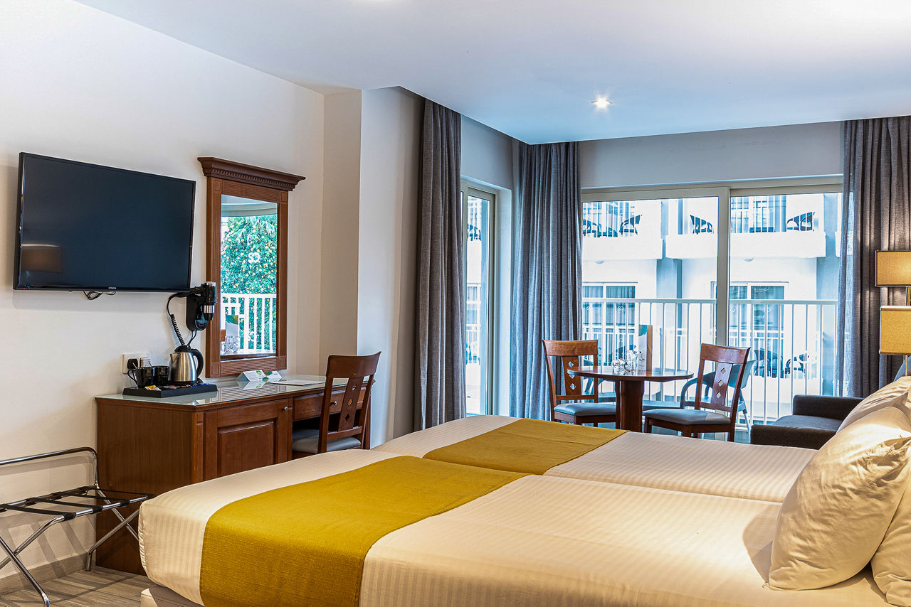 Internal Double and Twin rooms sleep 2 adults and have a full bathroom, hairdryer, air conditioning, satellite TV, fridge, tea and coffee making facilities, safety deposit box* and Wi-Fi* (please note, this is an internal room with no balcony or window). Standard Double and Twin rooms sleeping up to 3 adults with a balcony or terrace, Junior suites sleeping up to 3 adults with a balcony or terrace and with a kitchenette, Deluxe studios sleeping up to 4 adults with a balcony or terrace and with a sofa, kitchenette and dining facility, Double and Twin rooms for Sole Use or Single Parent Use and Junior suites for Sole Use or Single Parent Useare also available.