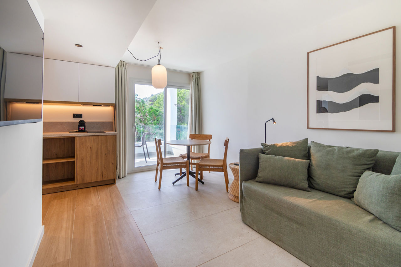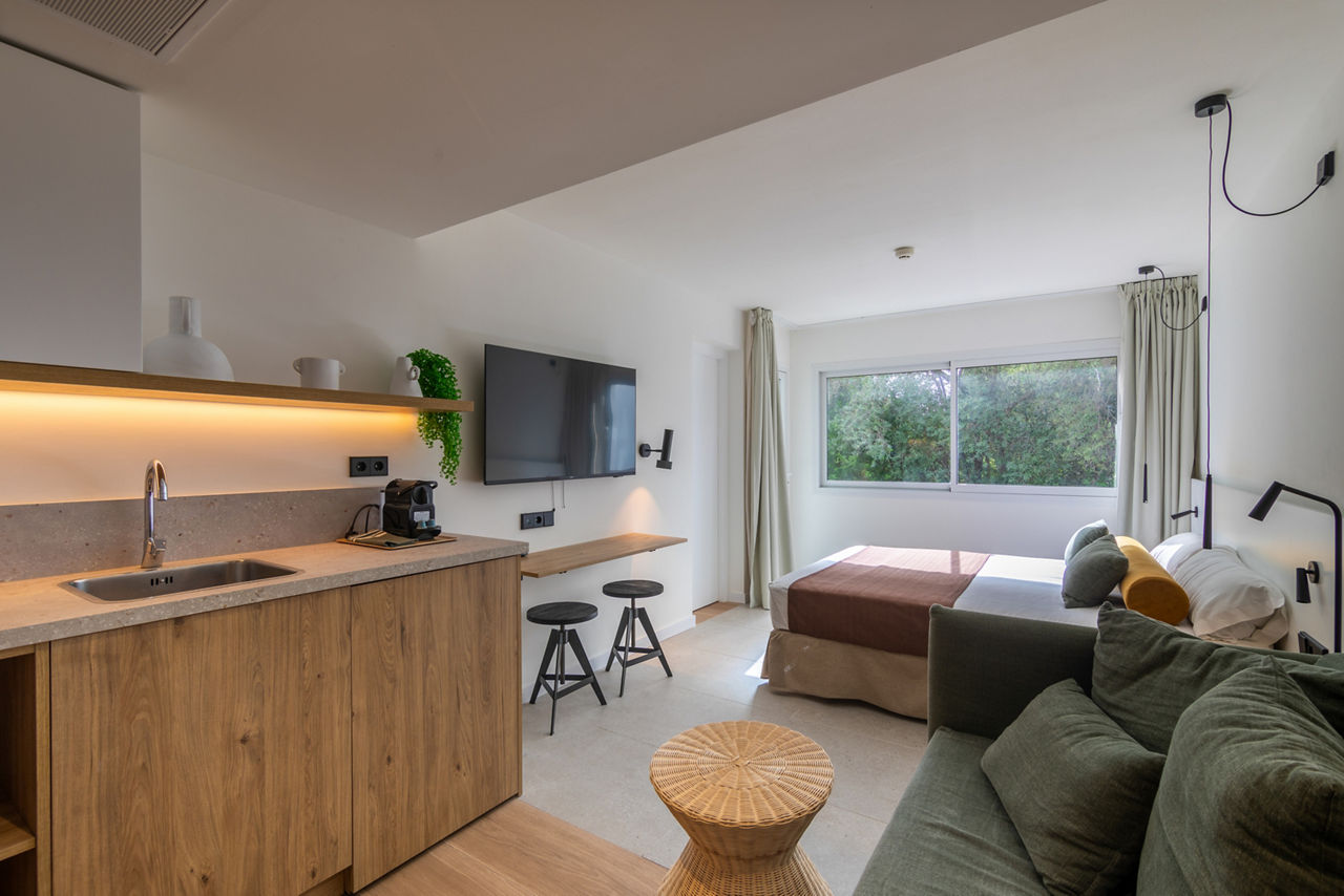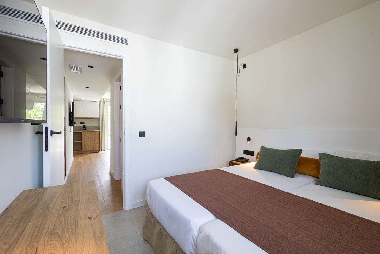 One bedroom apartments sleep up to 4 adults and have TV, living area with sofabed, air-conditioning, kitchenette with fridge, cooking rings, oven and toaster, hairdryer, full bathroom and balcony or terrace. Two bedroom apartments sleep up to 5 adults and have 2 twin bedrooms or twin bedroom and room with bunk beds. Larger two bedroom apartments sleep up to 6 adults and have 2 twin bedrooms and 2 sofa beds in the living area.