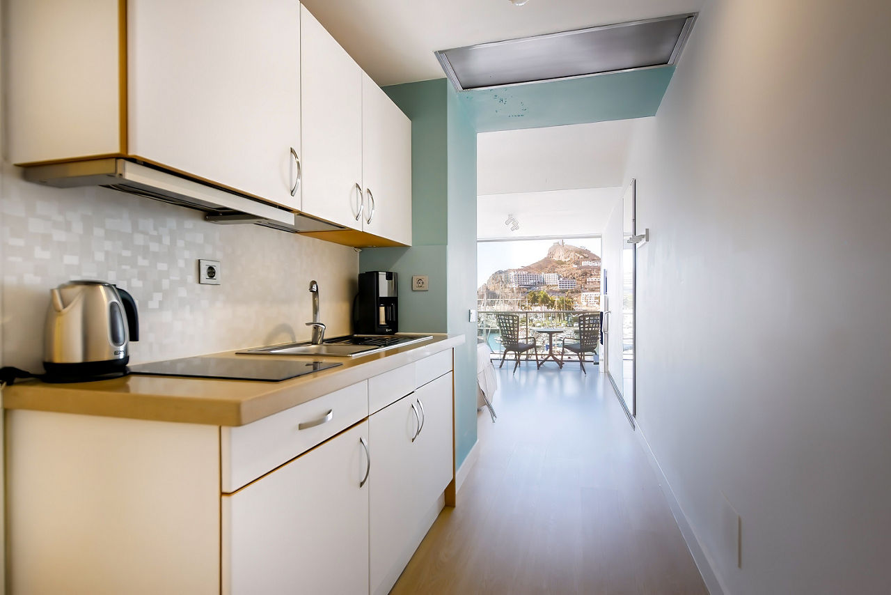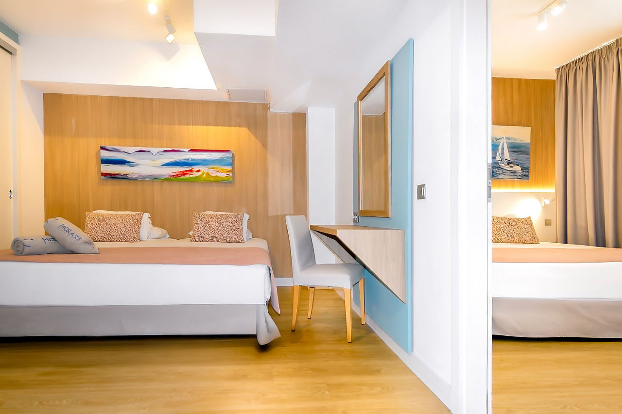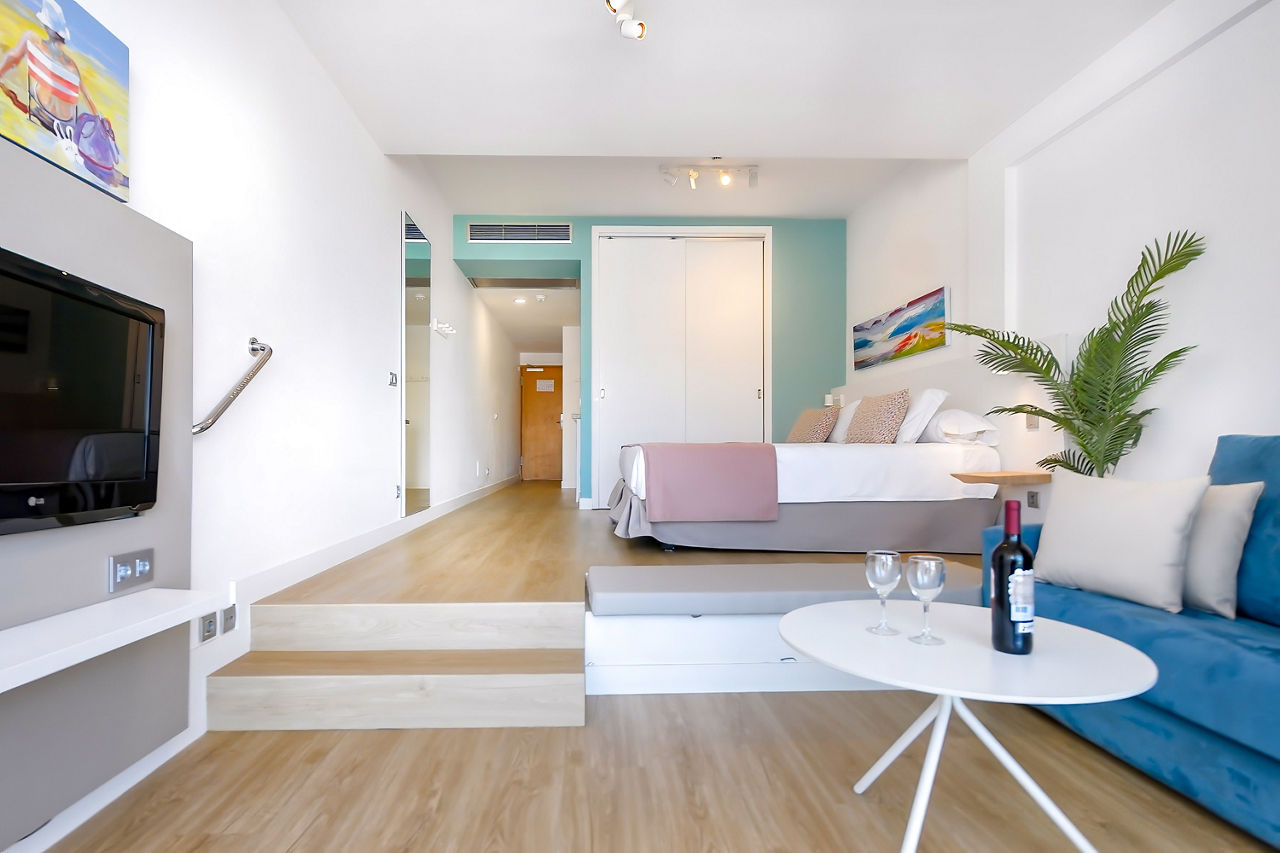 Studios sleep up to 2 adults and have air-conditioning, kitchen with electric hob, microwave, fridge, toaster and kettle, bathroom with hairdryer and balcony or terrace. One Bedroom apartments with Pool View sleeping up to 3 adults and Double apartments (one separate bedroom and second bedroom as part of the open plan living area) sleeping up to 4 adults are also available. From 1st May 2015, One Bedroom Premium Connect apartments inclusive of tablet with unlimited Wi-Fi throughout the hotel (deposit payable locally) are also available.