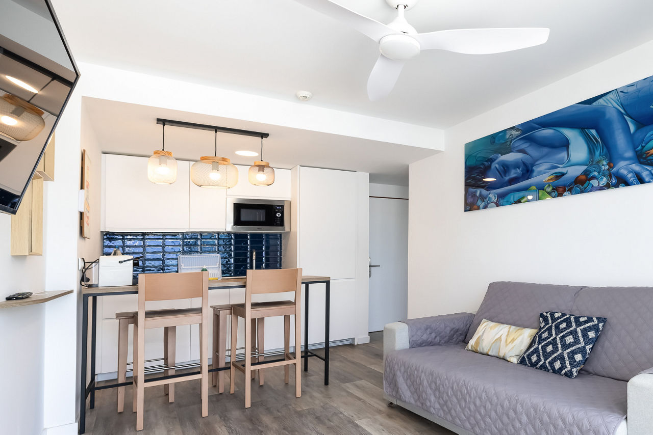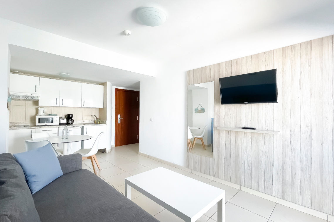 Studios sleep up to 2 adults and have bathroom containing a bath with shower attachment or shower, hairdryer, flat screen television, double cooking rings, fridge, microwave, tea and coffee making facilities and balcony or terrace. One Bedroom apartments sleeping up to 2 adults and 2 children are also available.