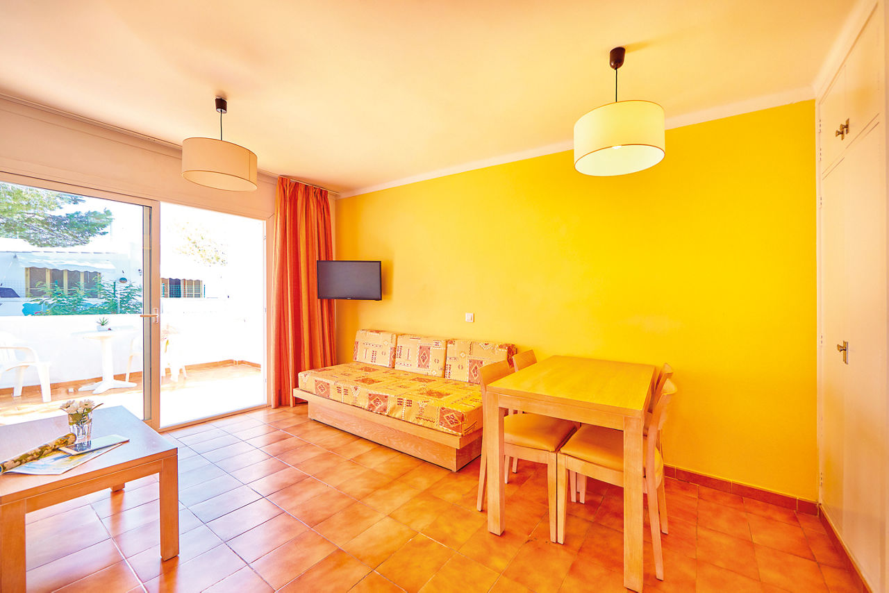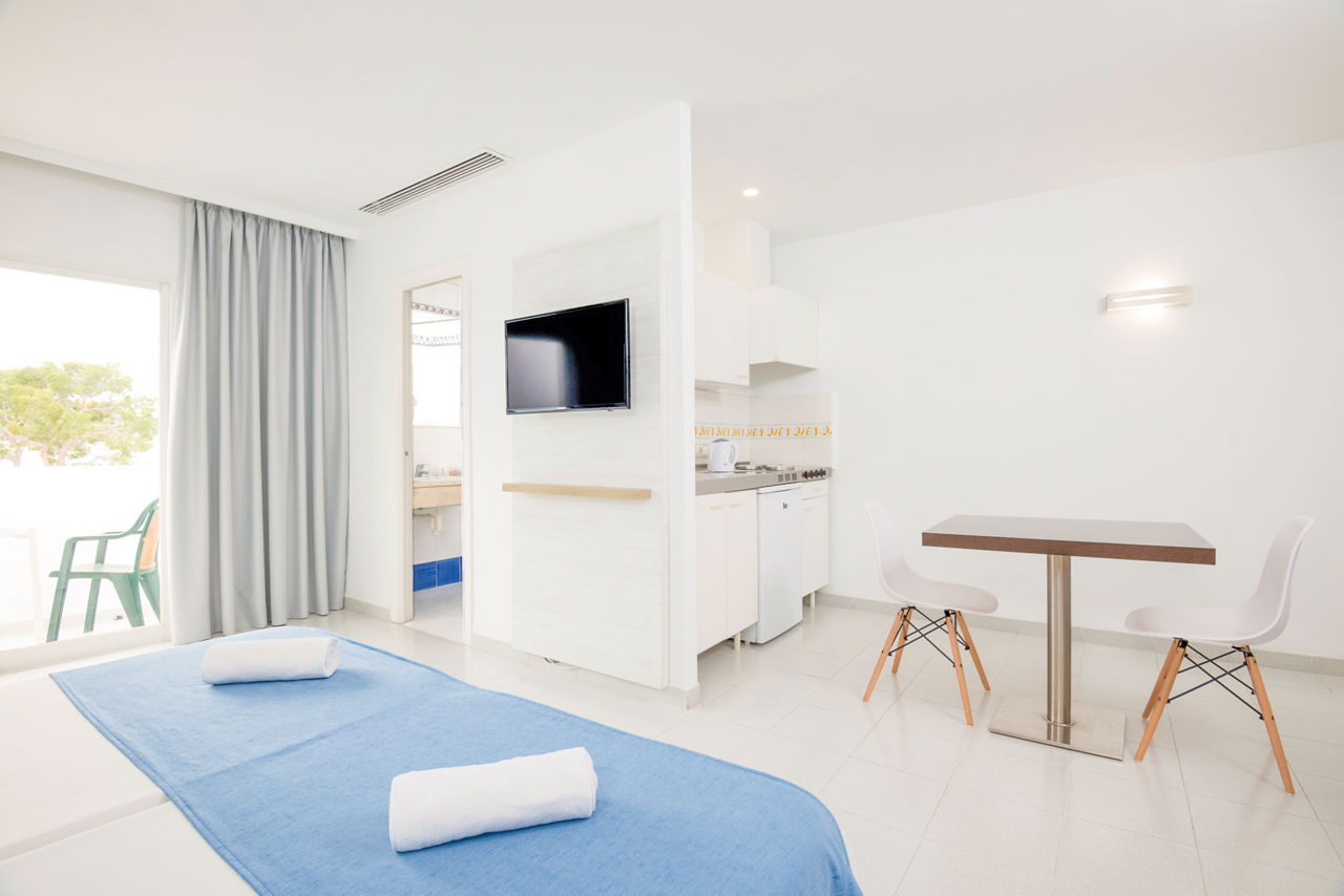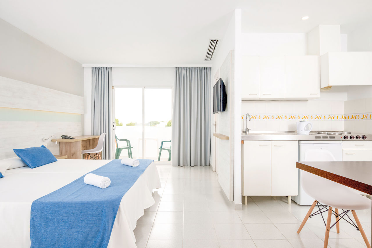 Double rooms sleep up to 3 adults and have bathroom containing a bath with shower attachment, air conditioning (15 May-15 Sep), television and balcony or terrace. Studios and One Bedroom apartments are also available.