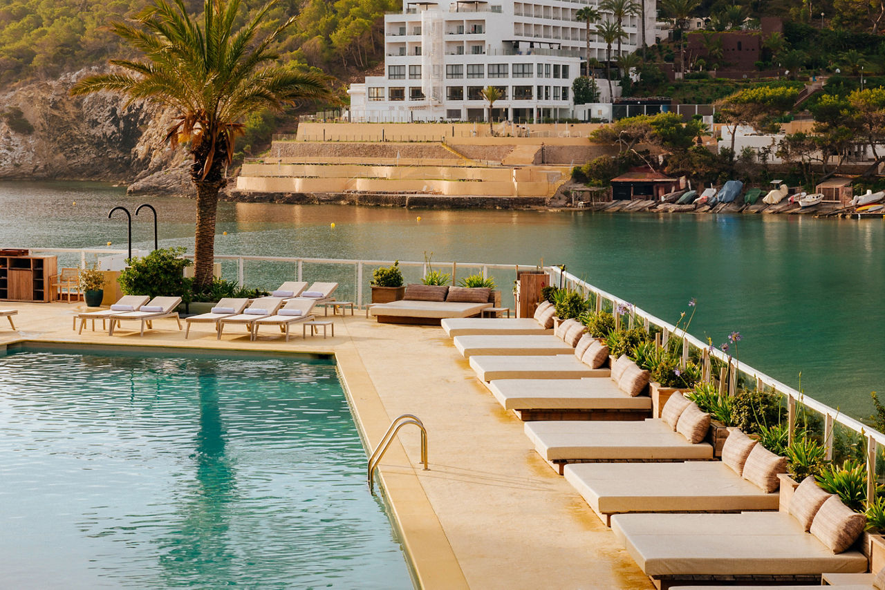 The Mondrian Ibiza hotel is a luxurious and contemporary retreat with a sleek design and vibrant atmosphere. Situated close to the stunning shores of Cala Llonga, the hotel boasts breath-taking views of the Mediterranean Sea and direct access to the beach. Its avant-garde architecture, featuring geometric shapes and bold colours inspired by the famous artist Piet Mondrian, creates a visually stunning backdrop for a truly unique experience. With luxurious amenities, ocean front poolside DJs, stylish rooms and suites and state of the art fitness centre, the Mondrian Ibiza offers a haven of relaxation and indulgence - perfect for couples or friends looking for a sophisticated Balearic break. For those who fancy exploring, Ibiza town is just a short drive away with many bars, restaurants and the UNESCO site, Dalt Vila.