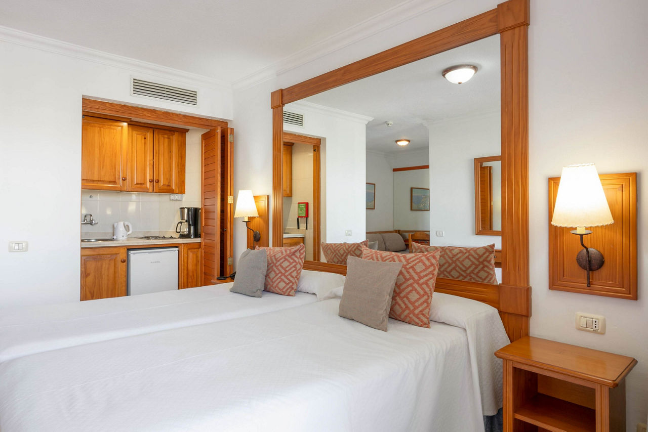 Studio rooms sleep up to 3 adults and have separate single beds or one double bed and optional sofa bed, bathroom with bath, hairdryer, fully equipped kitchen with electric hob, refrigerator, television, balcony and individually controlled air-conditioning. Studio rooms for single use are also available.