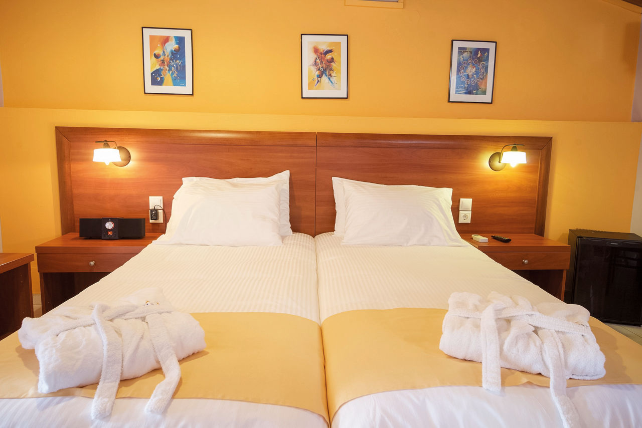 Double and Twin rooms sleep up to 3 adults and have bathroom containing a bath or shower, air conditioning, hairdryer, television, mini-bar*, safety deposit box and balcony or terrace. Double and Twin rooms for Sole Use are also available.