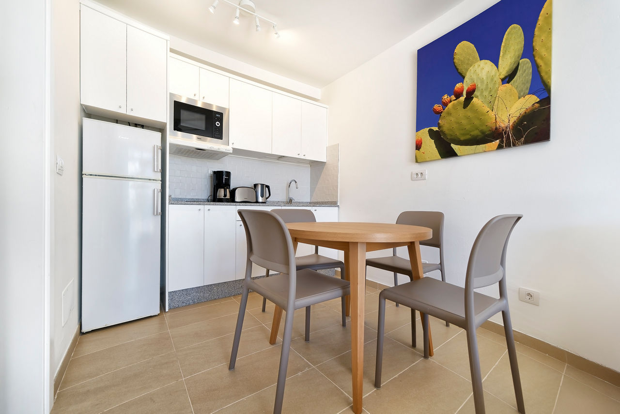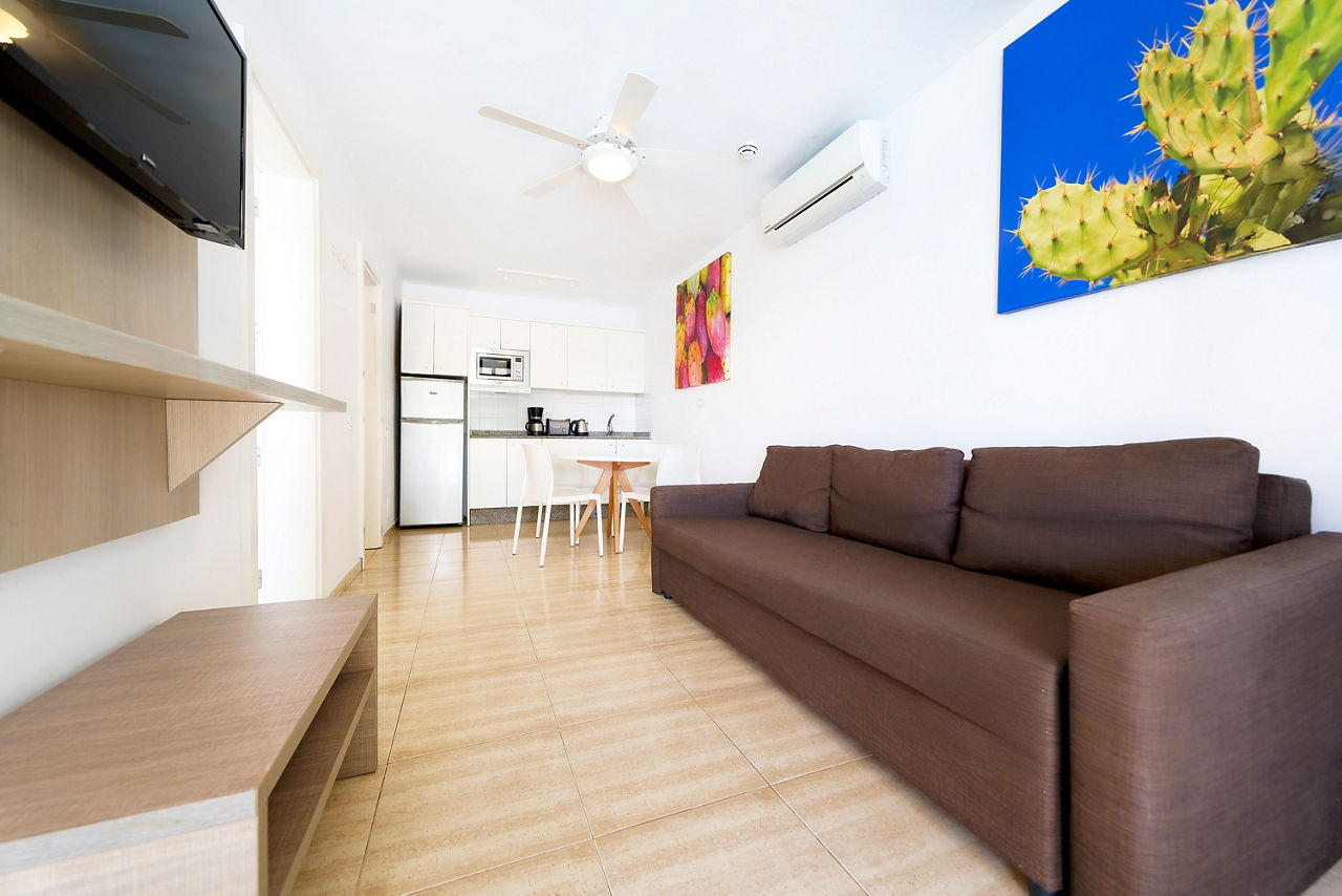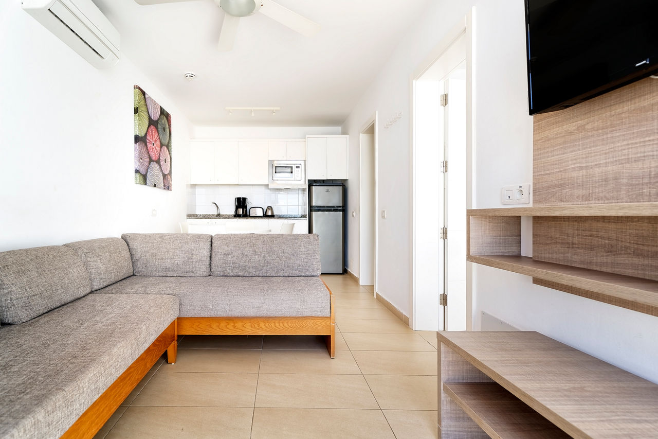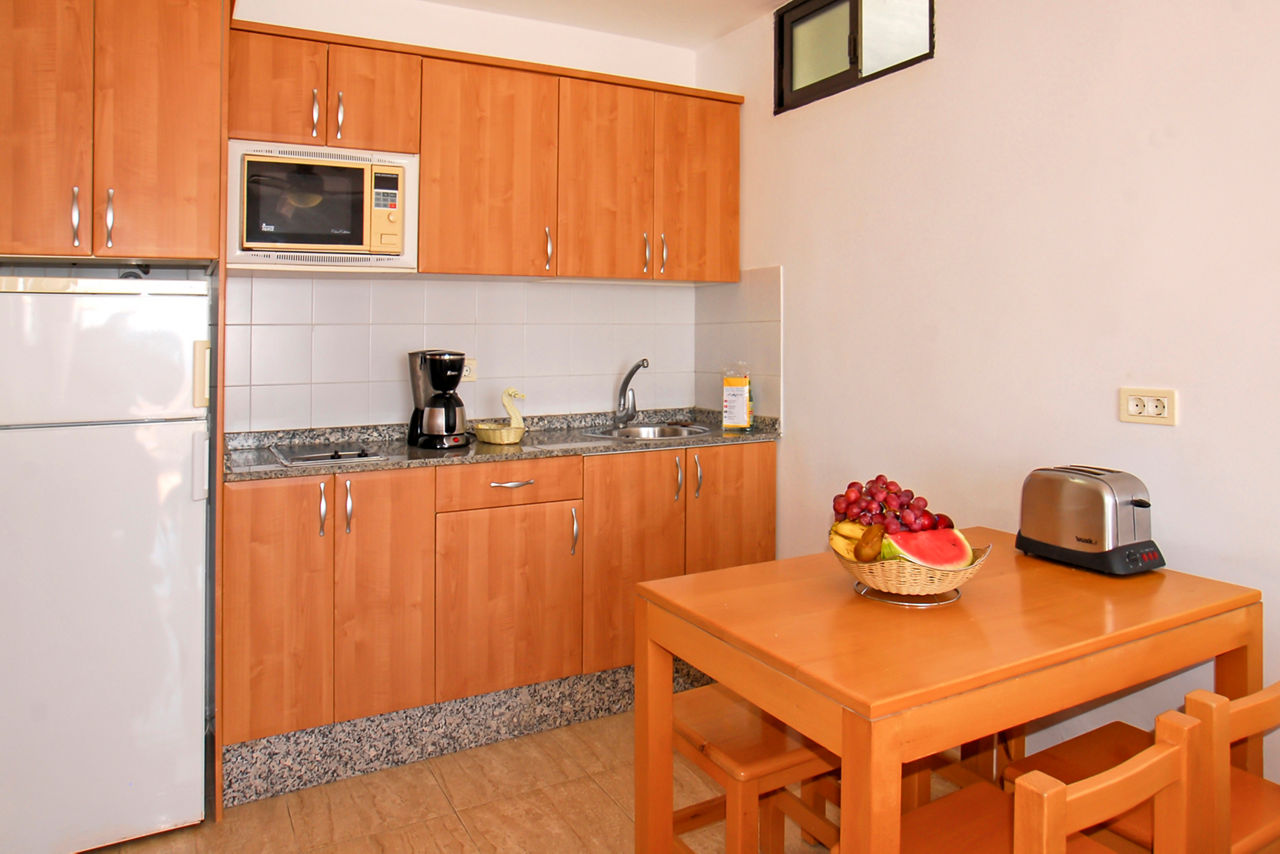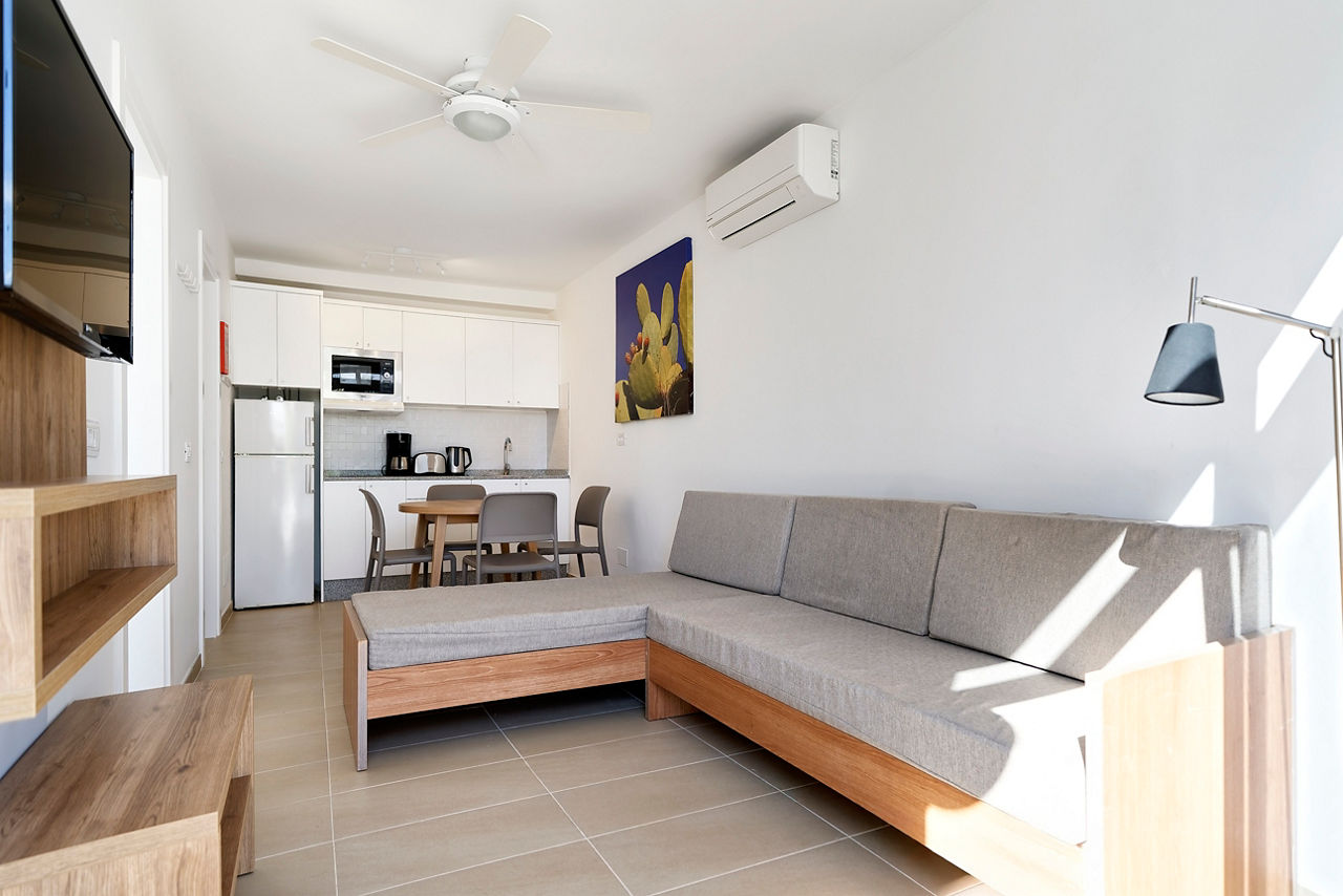 One Bedroom apartments sleep up to 4 adults and have separate bedroom, full bathroom, ceiling fan, lounge area with with sofa beds, satellite TV*, ceiling fan, kitchenette with dining area, 2 cooking rings, microwave, fridge, coffee maker and toaster, and terrace with sea or side sea views. Studios sleeping up to 2 adults and 1 child are also available. From 01 May 2015, Club rooms sleeping up to 2 adults and 2 children and inclusive of modern furnishings, free satellite TV, safe, kettle, additional maid service, and sea views - some of the best from the hotel, are also available.