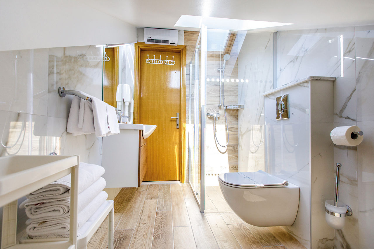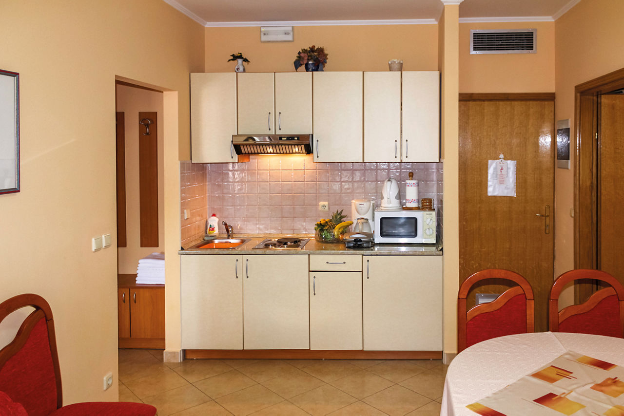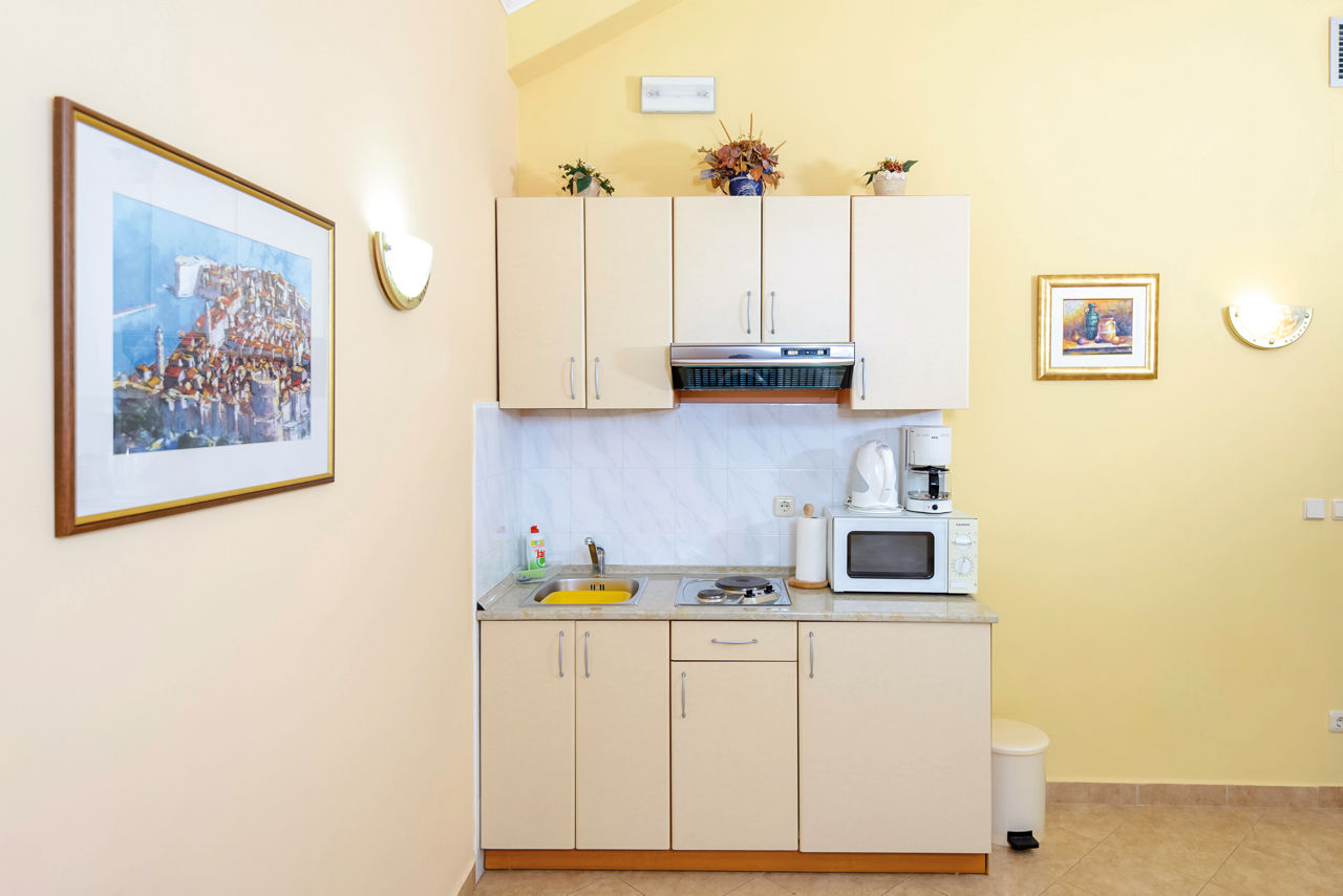 One Bedroom apartments sleep up to 3 adults or 2 adults and 1 child with a double bed and sofa bed and have a bathroom with shower only, hairdryer, air conditioning, satellite TV, kitchenette including fridge, cooking rings, microwave, toaster, dishwasher and tea and coffee making facilities and free Wi-Fi. Two Bedroom apartments sleep up to 5 adults or 4 adults and 1 child with double bed, twin beds and sofa bed and have a bathroom with shower only, hairdryer, air conditioning, satellite TV, kitchenette including fridge, cooking rings, microwave, toaster, dishwasher and tea and coffee making facilities and free Wi-Fi. These rooms are located on the top floor in the attic of the property. Two Bedroom apartments with Sea View and Balcony are available on request. Please note that One Bedroom apartments and Two Bedroom apartments without Sea View are without a balcony.
