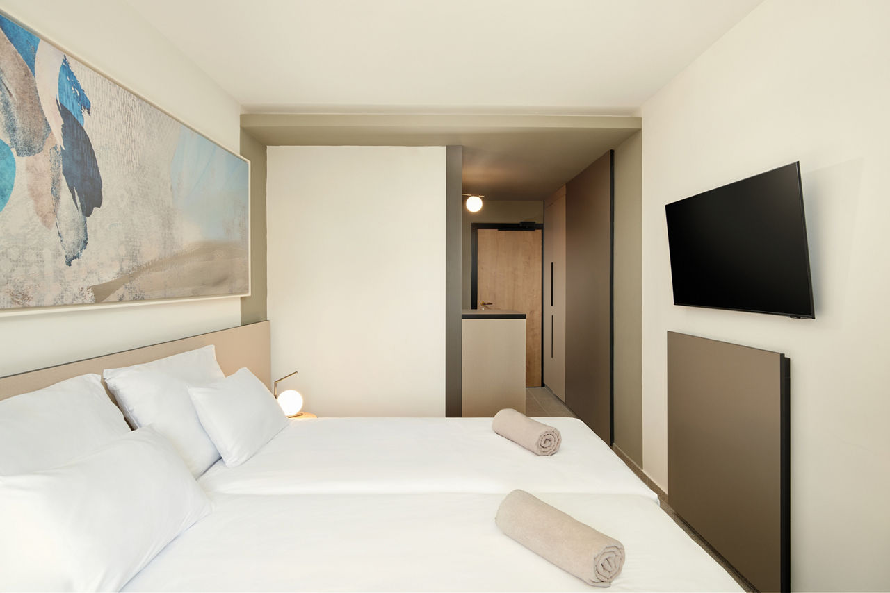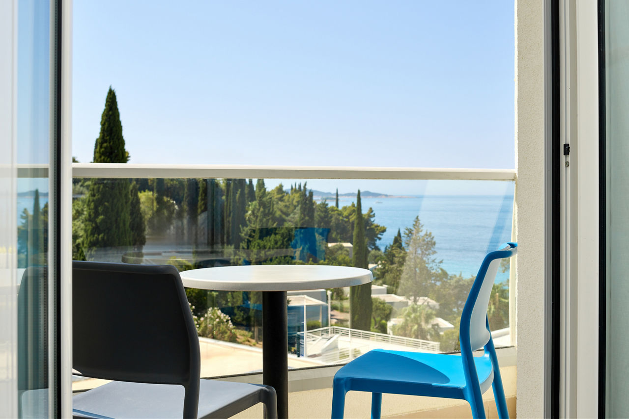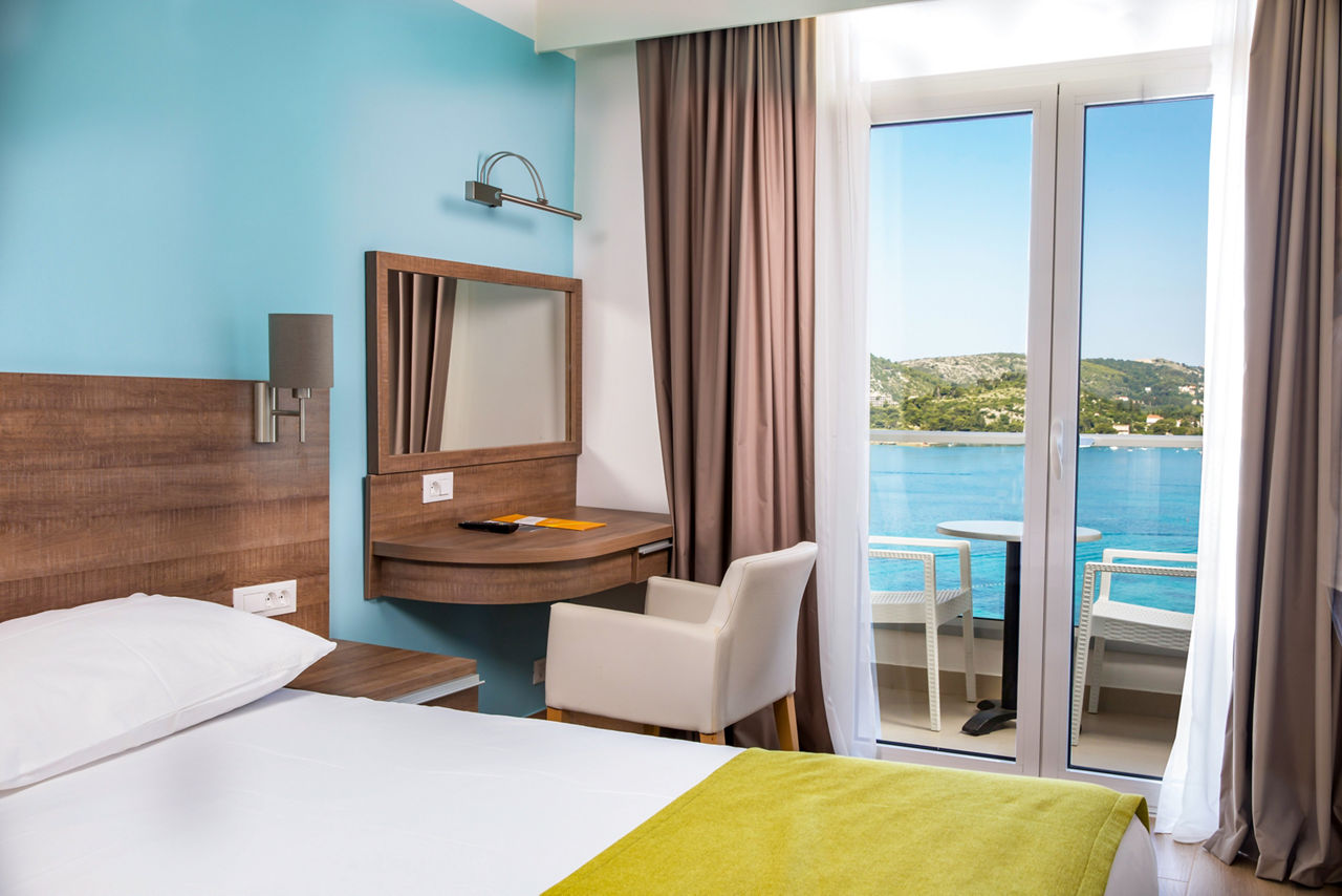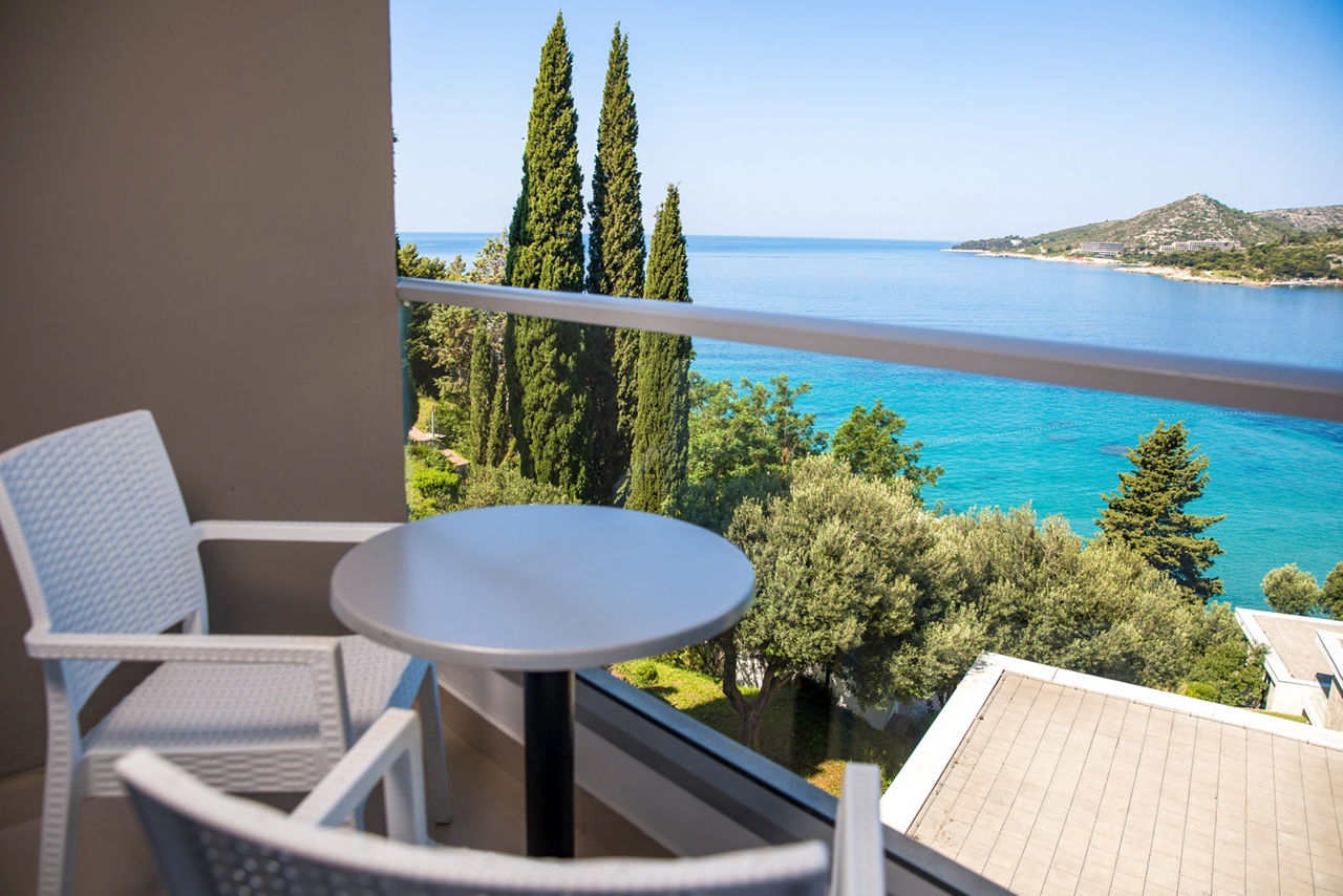 Double and Twin rooms sleep up to 2 adults and have a bathroom with shower, hairdryer, air conditioning, flat screen satellite TV and a balcony with side sea views. Double and Twin rooms in the annex sleep up to 3 adults or 2 adults and 1 child and have a balcony with side sea views.