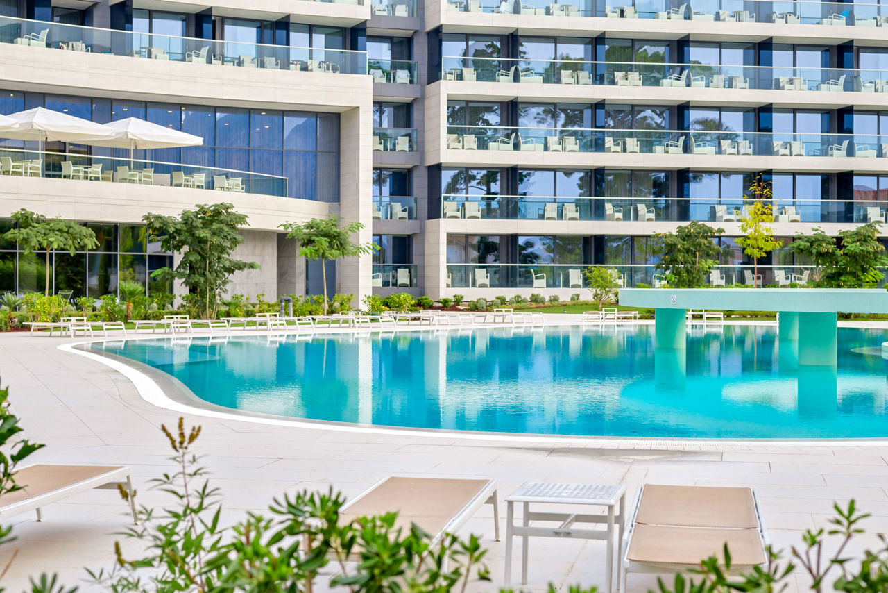 Outdoor saltwater swimming pool with terrace and sun loungers. Children?s outdoor swimming pool.Transfer Time