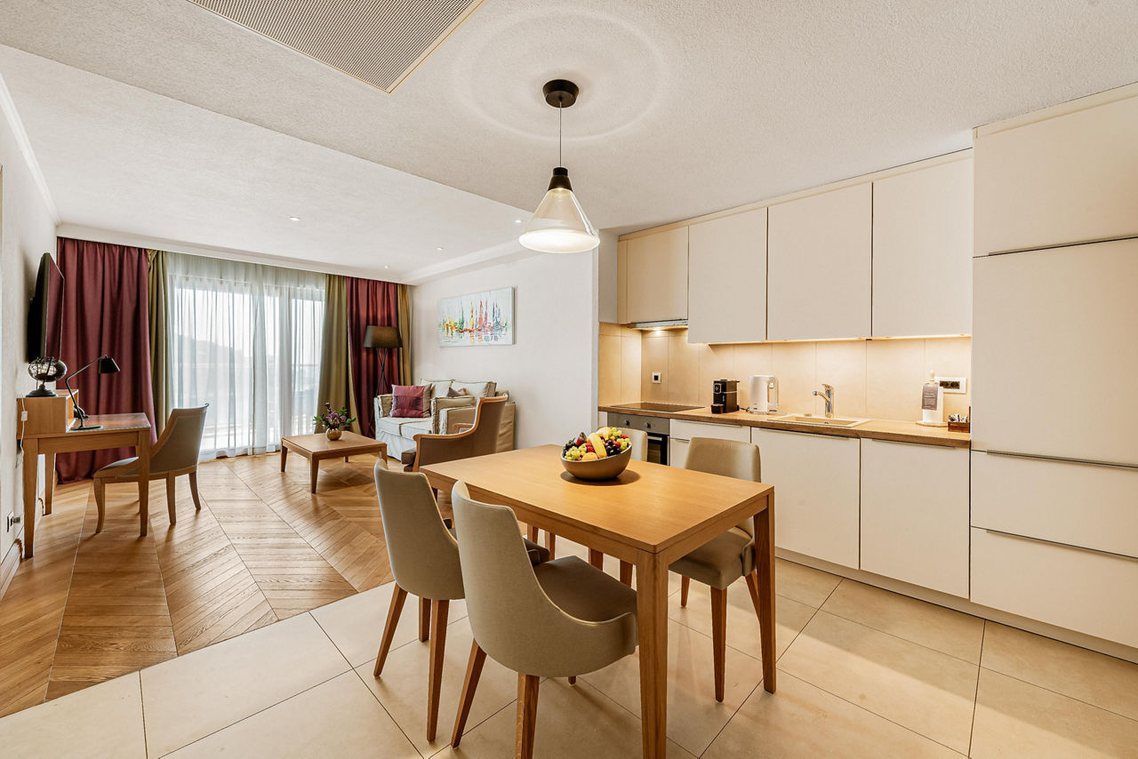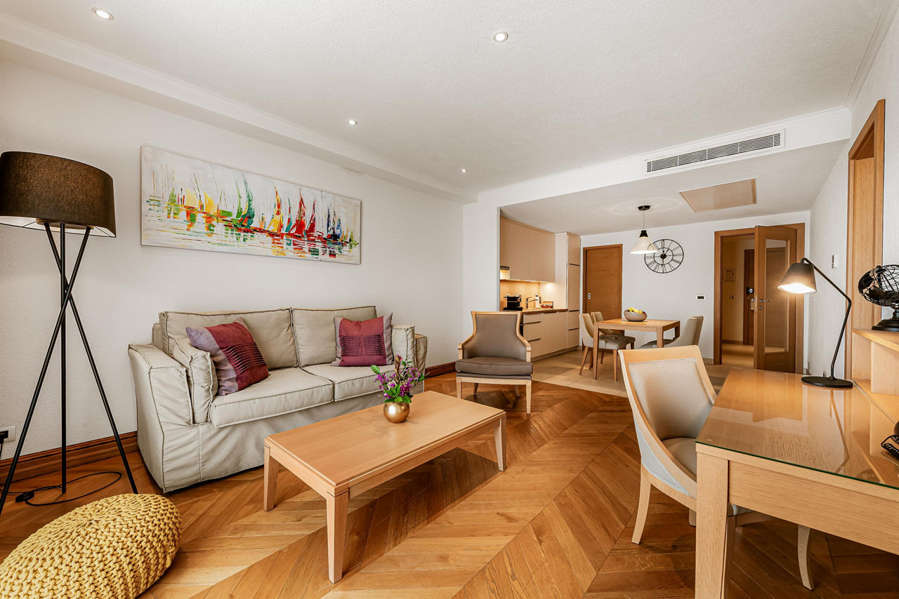 Luxury One Bedroom suites sleep up to 3 adults and have bathroom containing a bath with shower attachment, air conditioning, bathrobe and slippers, flat screen television, kitchenette and balcony. Room upgrade options are also available.