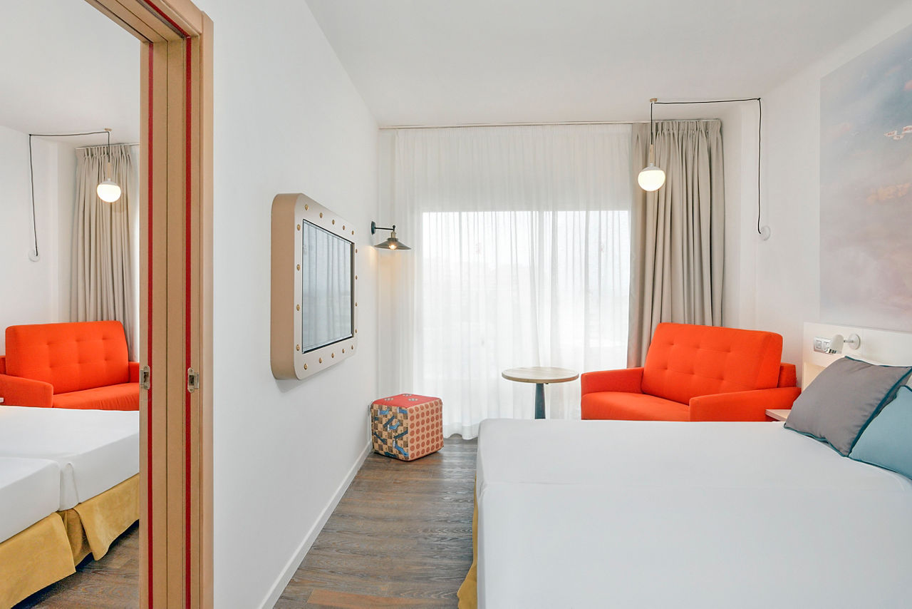 Double and Twin rooms sleep up to 3 adults and have bathroom with bath/shower, air conditioning, LCD satellite TV, mini fridge, kettle*(on request) and balcony or terrace with view to the mountains, garden or pools. Totally refurbished Family rooms sleeping up to 2 adults and 2 children with Double or Twin beds, a sofa-bed and French balcony are also available.