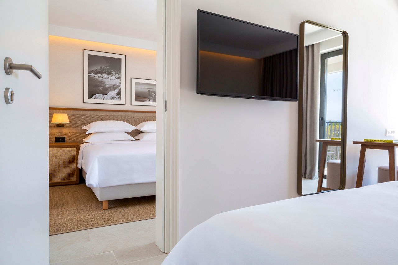 Double and Twin side sea view rooms sleep 2 adults and have a full bathroom, air conditioning, satellite TV, hairdryer and balcony or terrace. Superior side sea view rooms sleeping up to 2 adults and 1 child and Family rooms with garden view sleeping up to 3 adults and 1 child are also available.