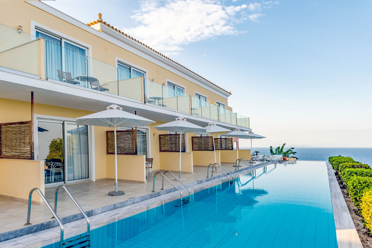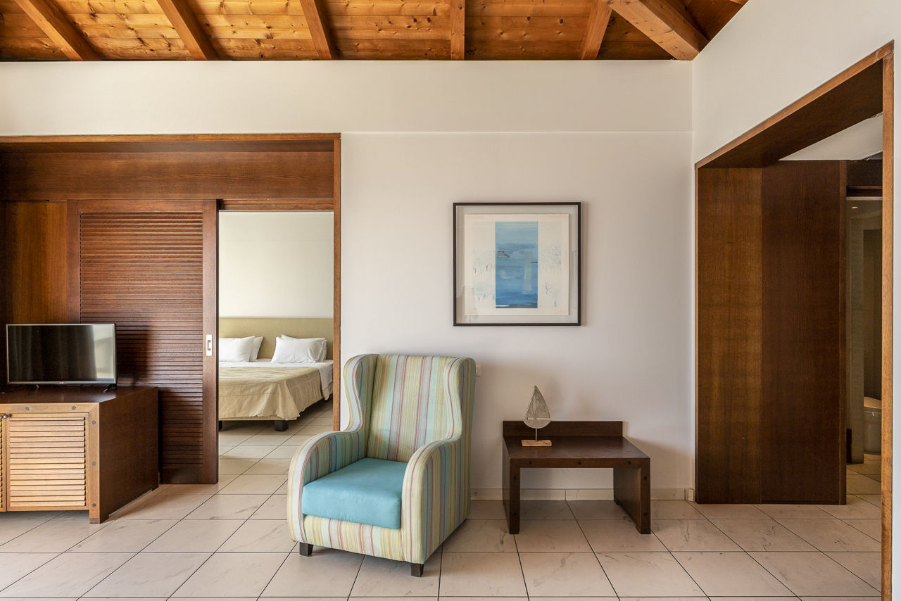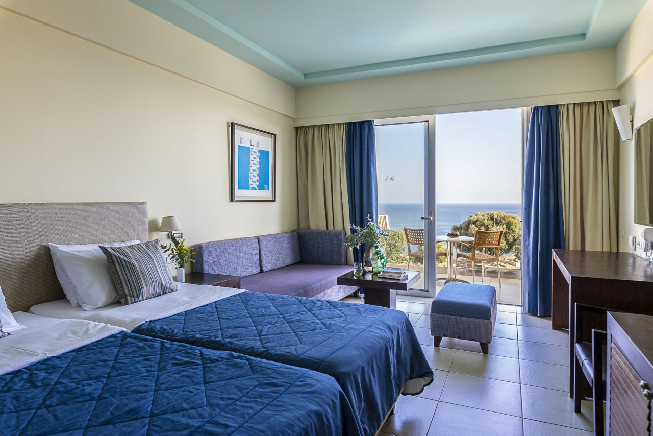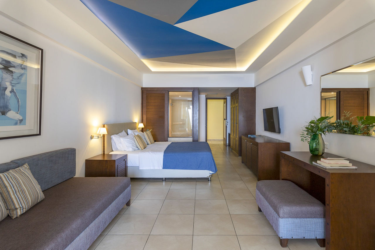 Standard Double or Twin rooms sleep up to 3 adults and have a full bathroom, air conditioning, satellite TV, Wi-Fi access, tea and coffee making facilities and balcony or terrace. Standard Double or Twin rooms with Sea View, Superior Double or Twin rooms, Superior Double or Twin rooms with Side Sea View and shared pool, Family rooms, Suites with Sea View, Suites with private pool, Two Bedroom Suites with Sea View and private pool and Standard Double or Twin rooms for Sole Use are also available.