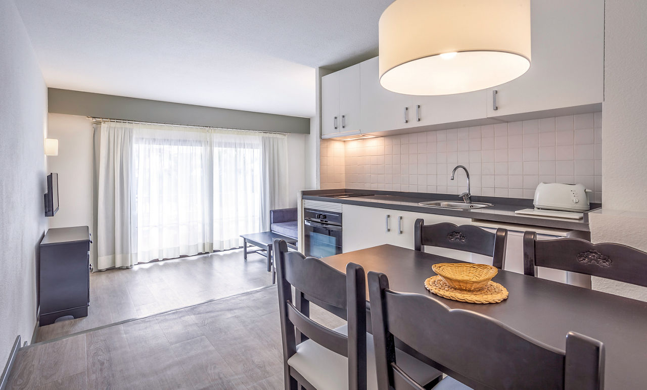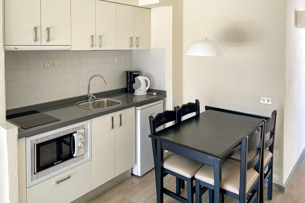 Studios sleep up to 2 adults and have twin beds, kitchenette with kettle, toaster, oven and 4 ring hob, fridge, TV, full bathroom and balcony or terrace. One bedroom apartments are as above but with sofa bed in the lounge. Two bedroom apartments are also available.