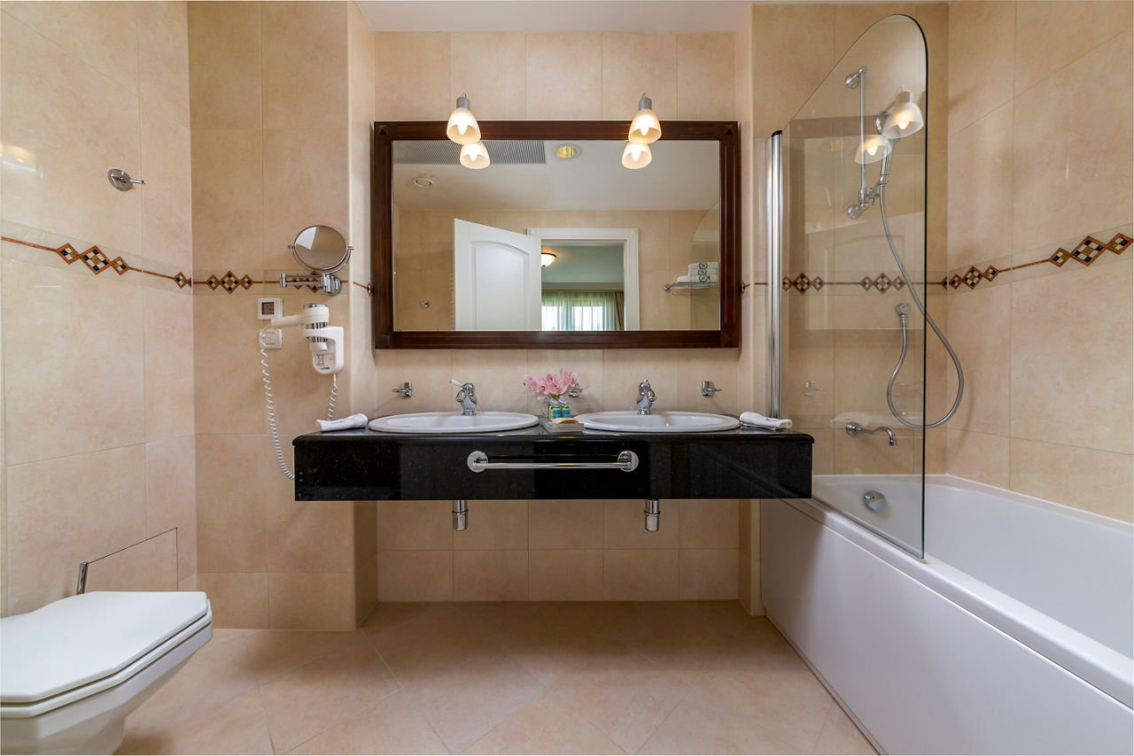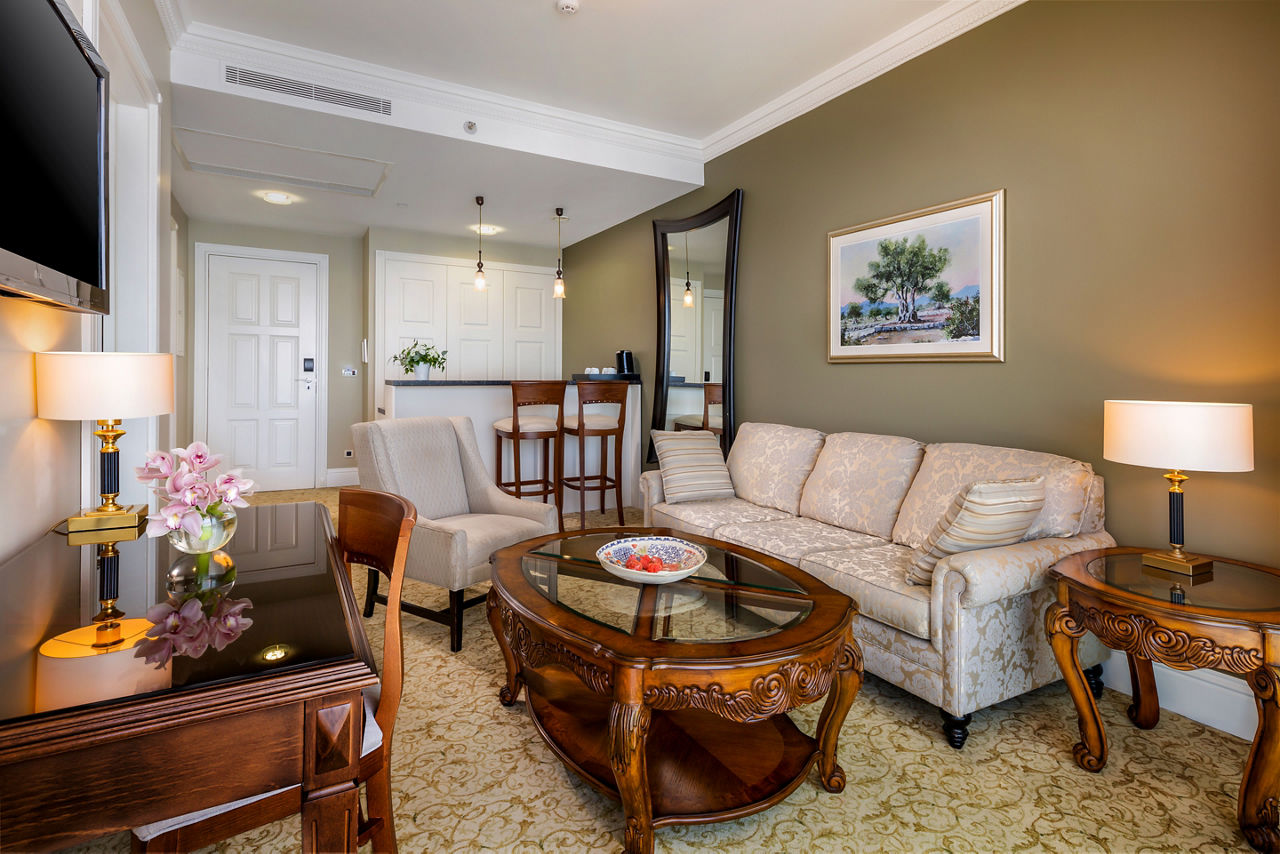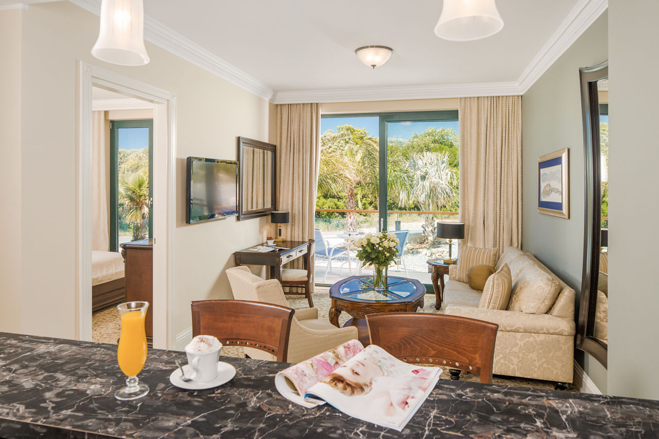 Deluxe suites sleep up to 3 adults and 1 child and have a full bathroom and separate shower room, hairdryer, bathrobes, slippers, air conditioning, 2 flat screen satellite TVs, free Wi-Fi, small kitchenette with cooking rings and crockery (on request), tea and coffee making facilities, living room with double sofa bed, balcony and sea views.