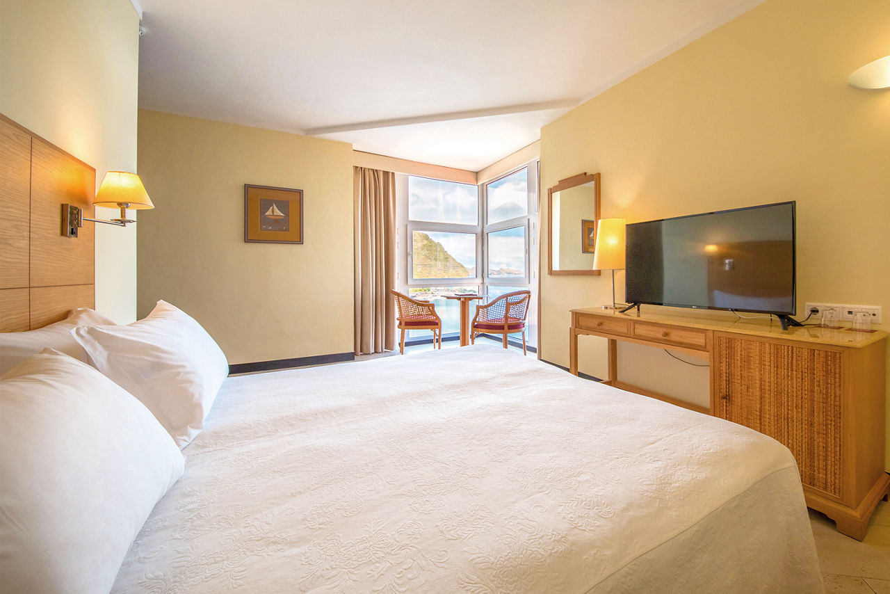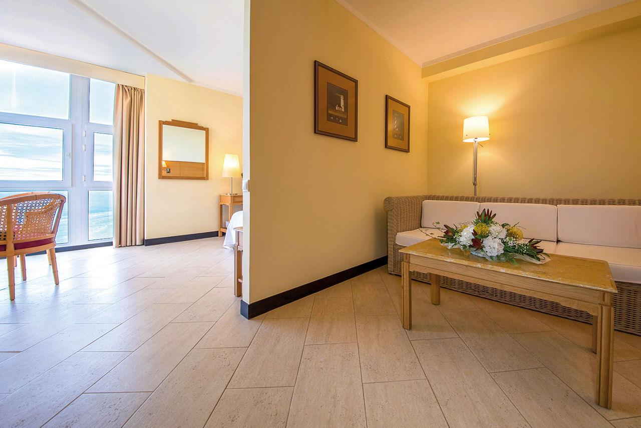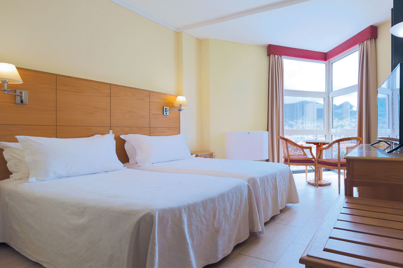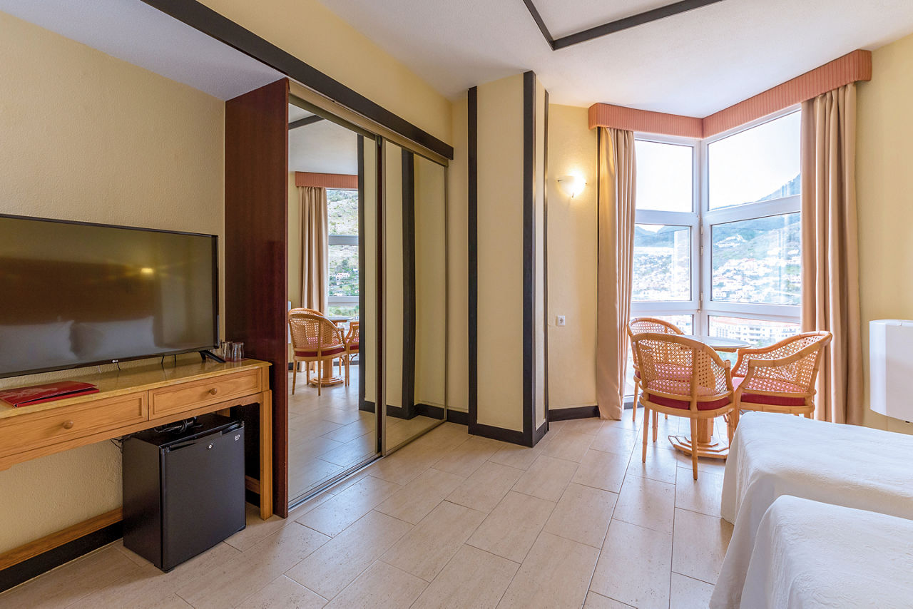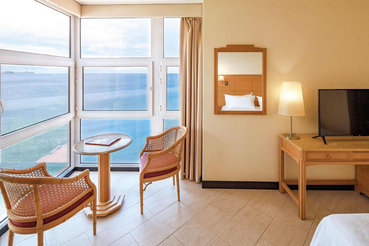 Twin rooms sleep up to 3 adults or 2 adults and 1 child and have a full bathroom and satellite TV. There is no balcony. Club Sea View rooms, Club Sea View rooms with balcony and Single rooms are also available. Suites with sea views sleeping up to 4 adults are also available. These do not have balconies.