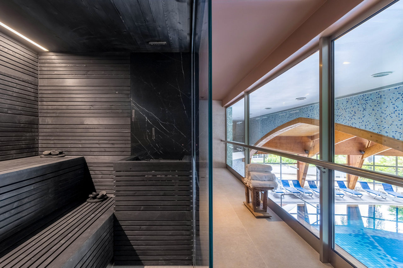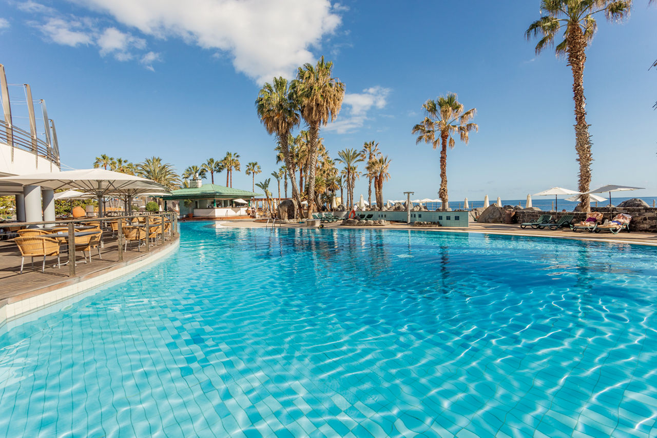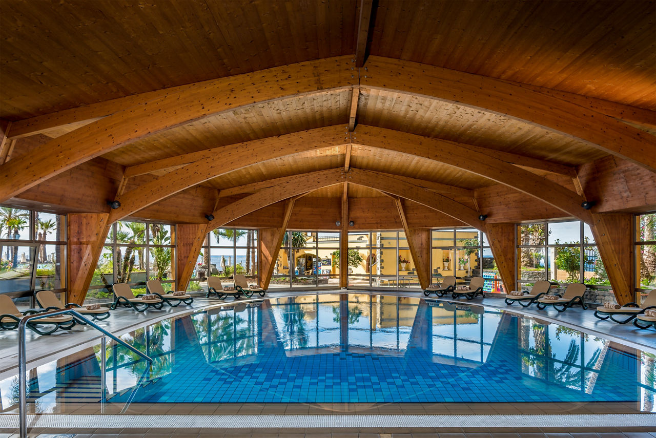 Surrounding the paved sun terrace are soaring tropical palms and a cascading waterfall creating an exotic ambiance; There are two large sea-water swimming pools one of which is heated and an ample supply of comfortable sun loungers; Indoor heated pool.