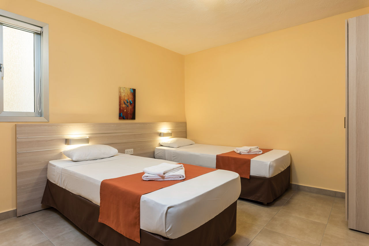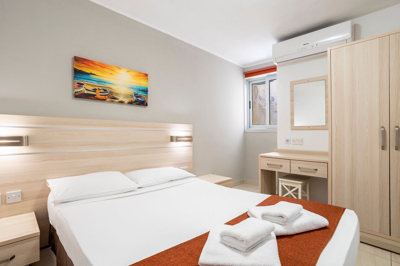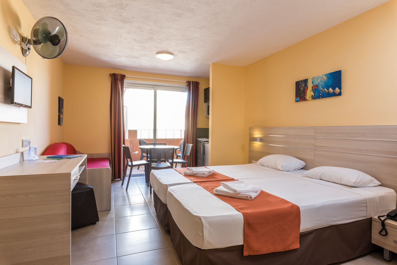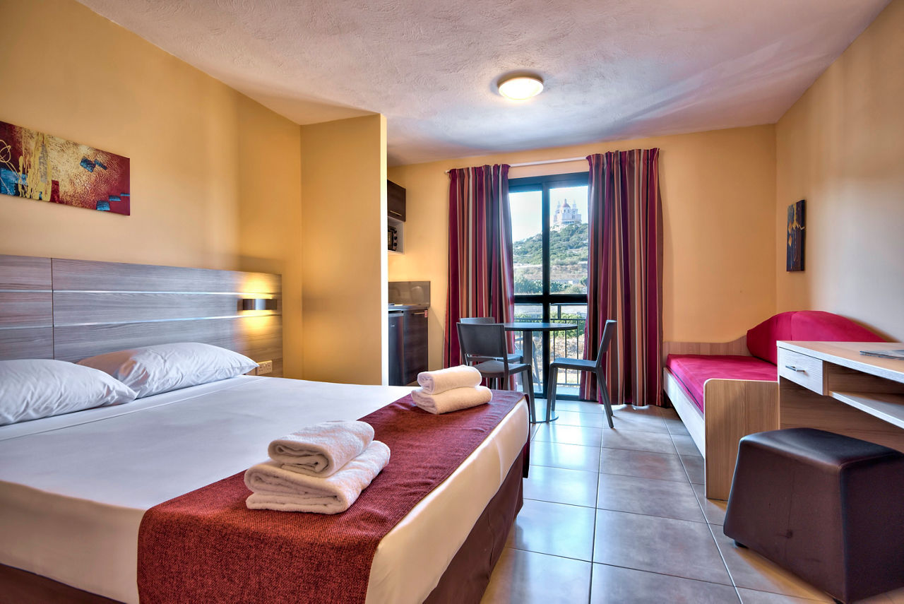 Standard studios sleep up to 2 adults and 1 child and have a bathroom with shower, kitchenette with 2 cooking rings, oven, fridge and kettle, Wi-Fi*, safety deposit box* and telephone*. Superior studios, One Bedroom apartments and Two Bedroom apartments are also available.