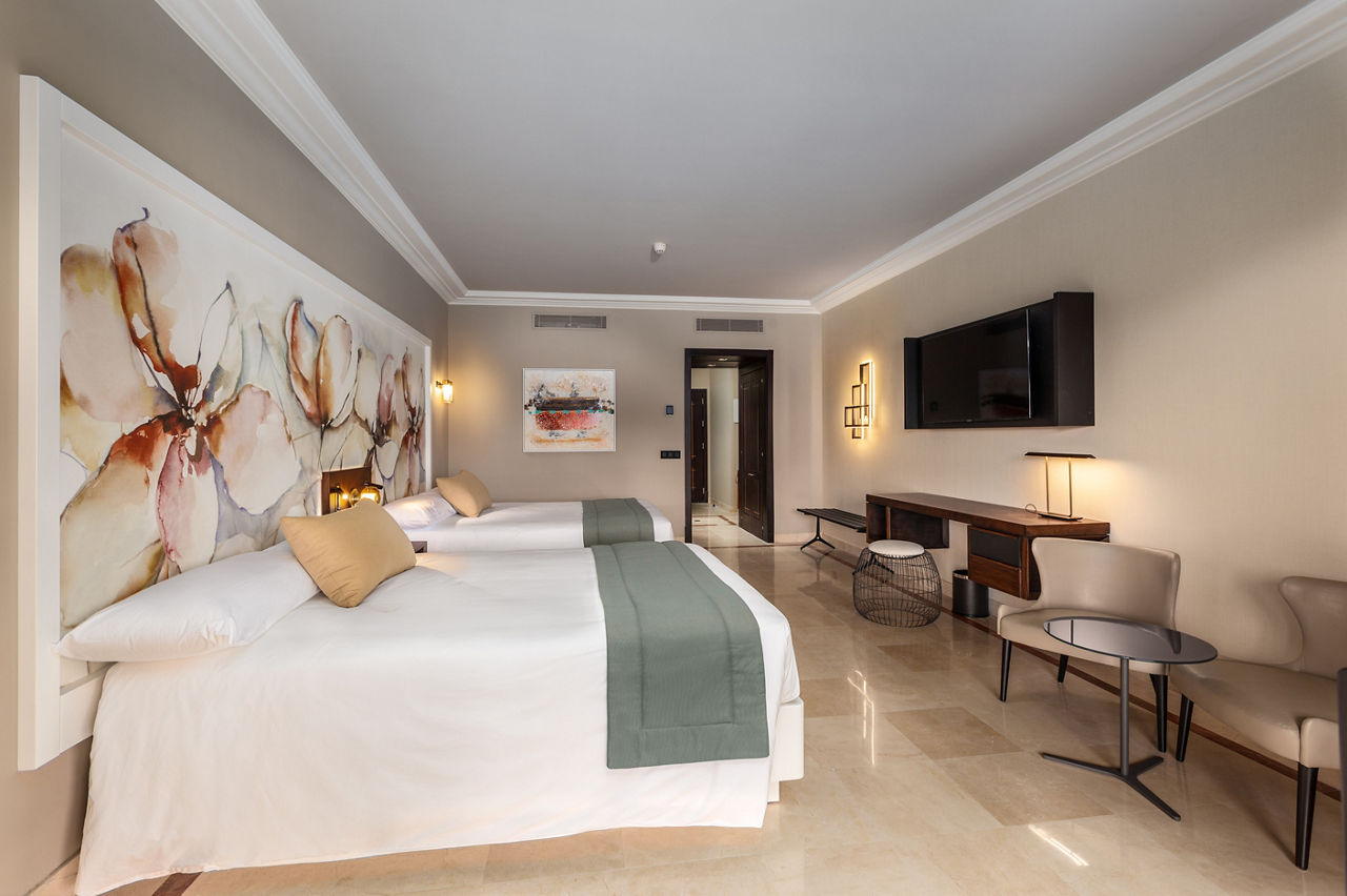 Double rooms sleep up to 3 adults or 2 adults and 1 child and have air-conditioning, full bathroom with shower and bathtub, hairdryer, satellite TV and balcony or terrace. Garden or Pool view rooms, Junior suites, Twin rooms for sole use are also available.