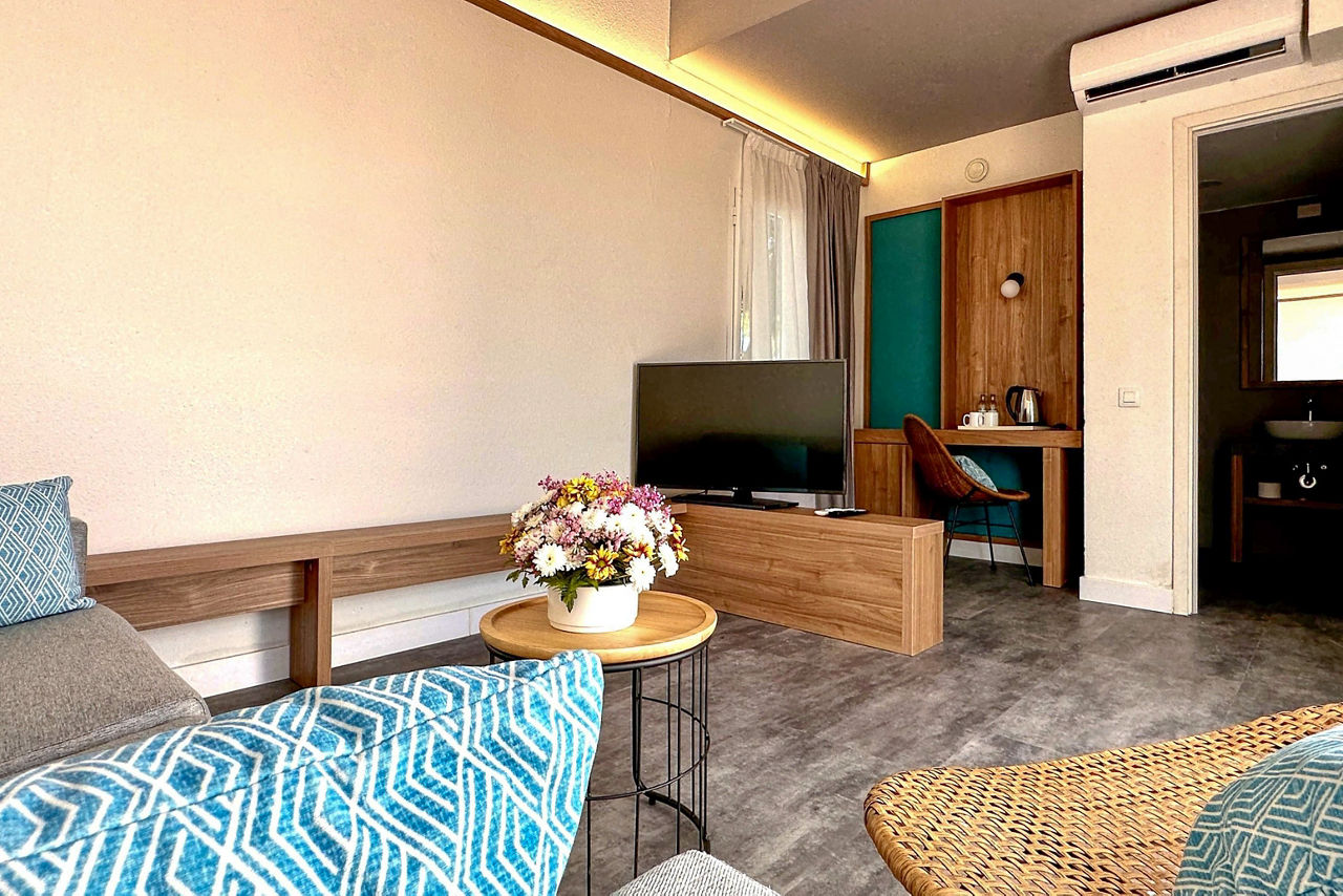 One bedroom apartments sleep up to 3 adults and 1 child and have bathroom containing a bath with shower attachment, flat screen television, double cooking rings, fridge, microwave terrace. Two bedroom apartments sleeping up to 5 adults and 1 child are also available.