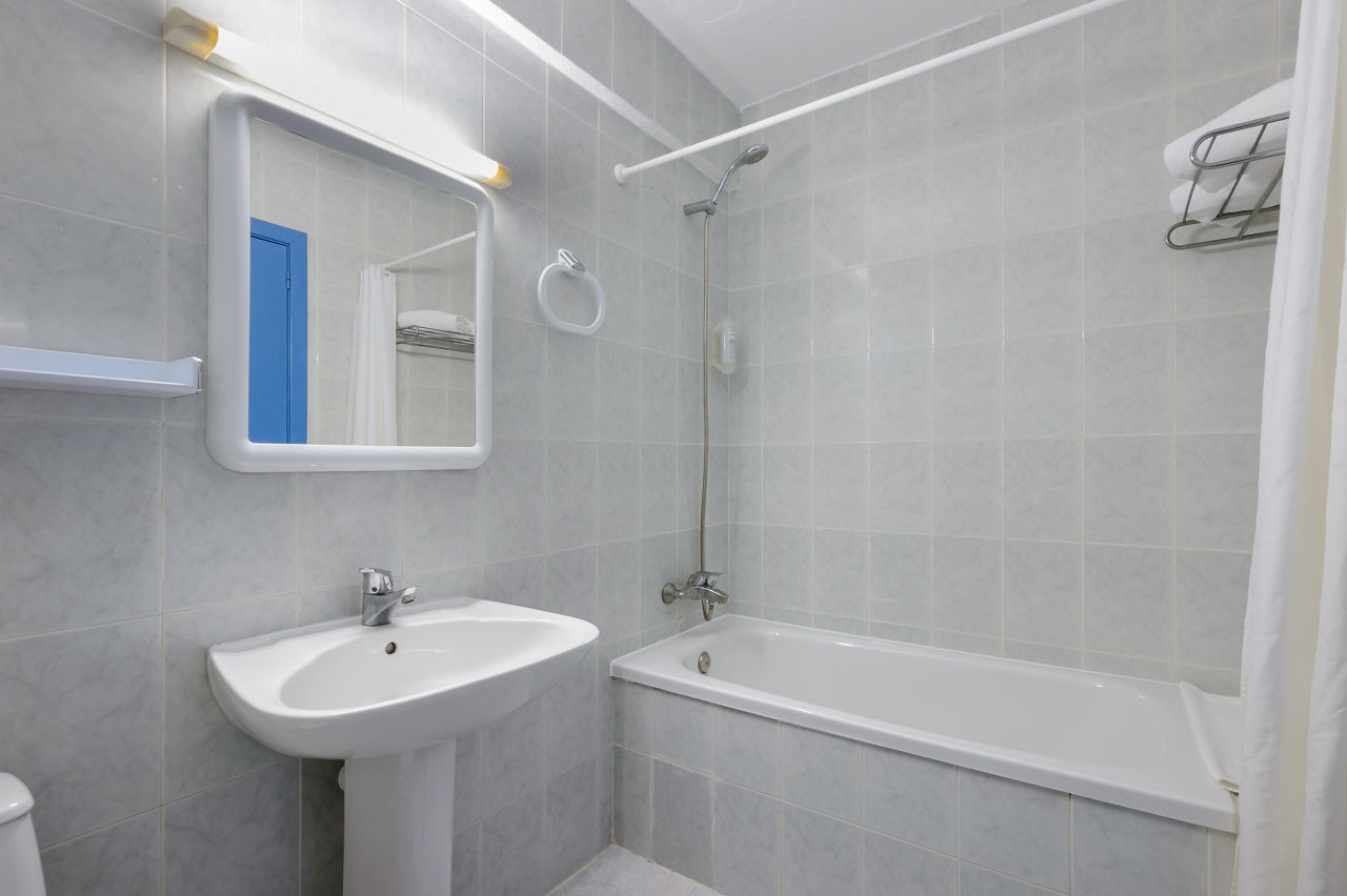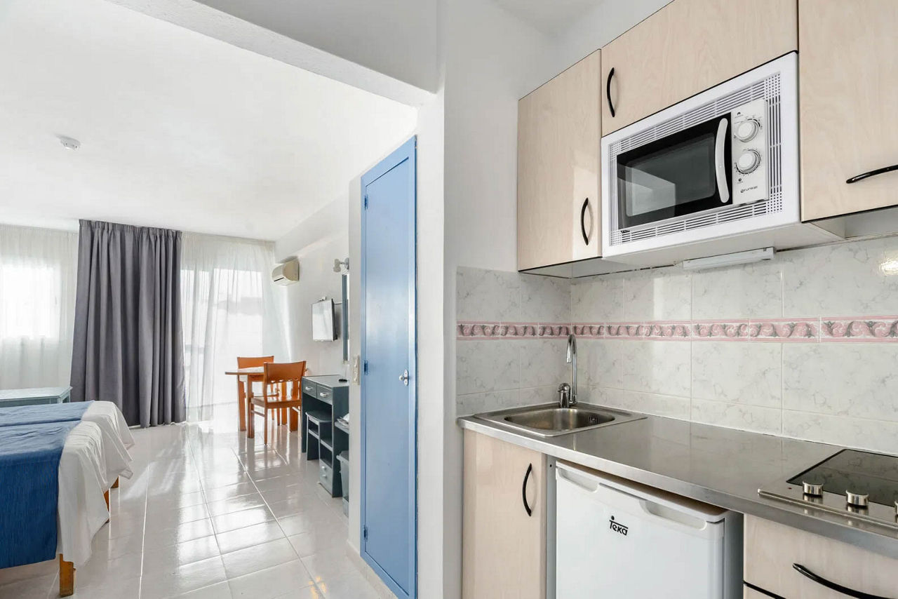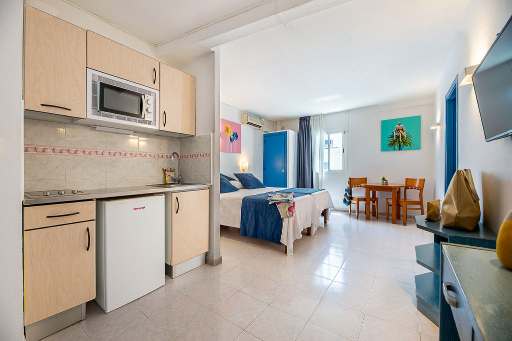 Studios sleep 2 adults and have twin beds, a bathroom containing a bath with shower attachment, air conditioning, television, double cooking rings, fridge and balcony or terrace. Studios sleeping 3 adults are also available and have a sofa bed for the third person.