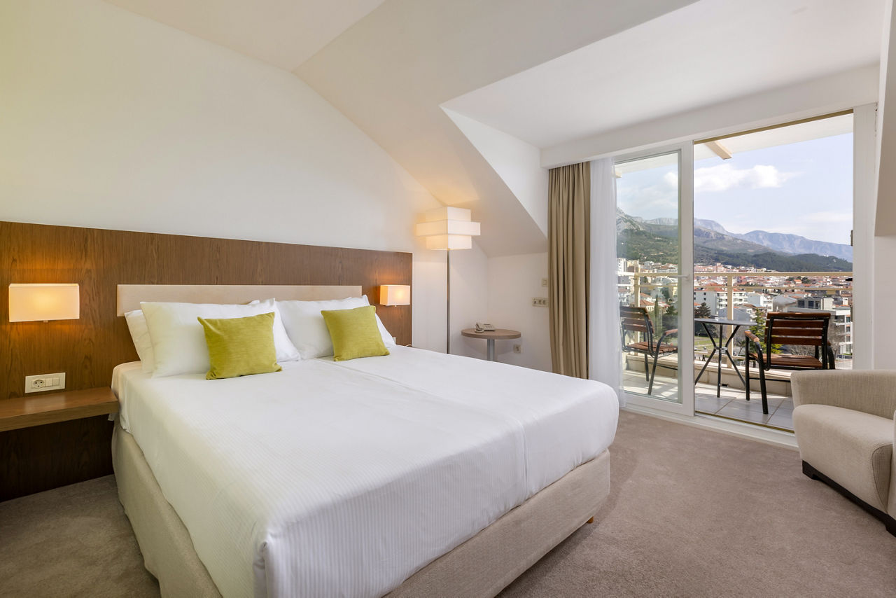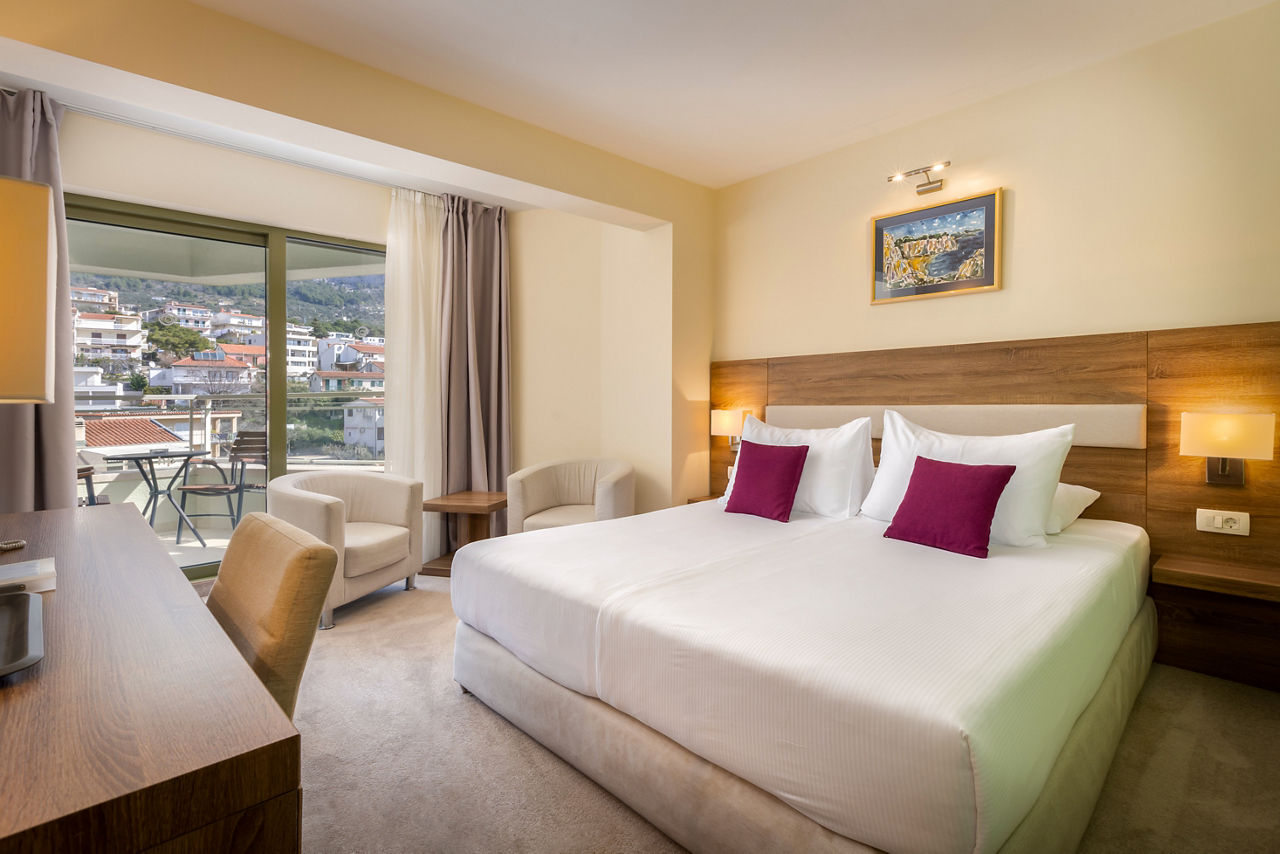 Double rooms sleep 2 adults and have a bathroom with bath, hairdryer, air conditioning, satellite TV, free Wi-Fi and a balcony or terrace. Superior Sea view rooms sleeping up to 3 adults or 2 adults and 1 child and Half Board are also available.