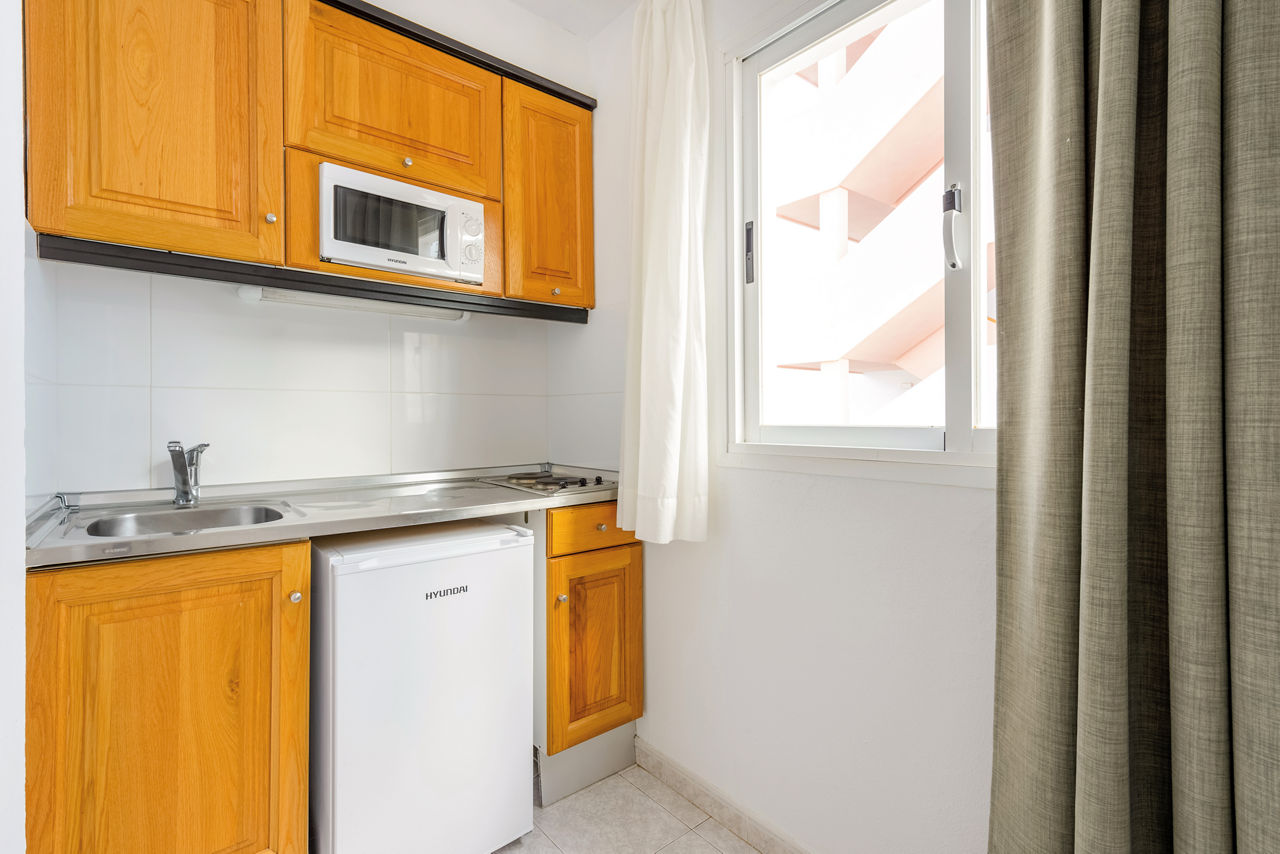 Studios sleep 2 adults and have bathroom containing a bath, air conditioning, hairdryer, flat screen television, fridge, microwave, single cooking rings and a balcony. One Bedroom apartments sleeping 3 adults and have the same facilities as above plus a separate bedroom with a sofa bed in lounge, are also available.