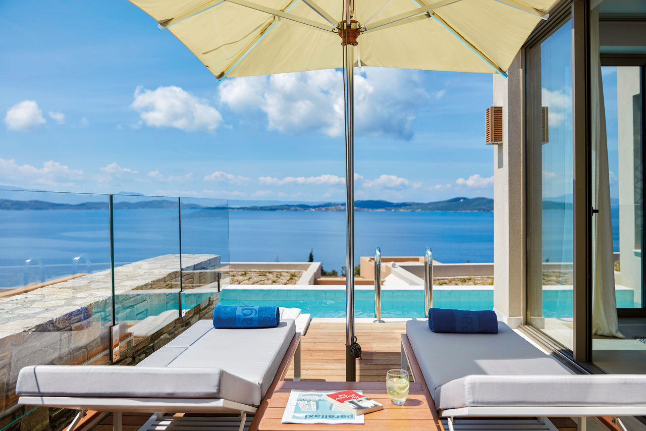 Junior Pool villas sleep up to 2 adults and 2 children and have bathroom containing a bath or shower, air conditioning, hairdryer, bathrobe and slippers, flat screen television, coffee making facilities, private plunge pool, sunbeds and terrace. Room upgrade options are also available.