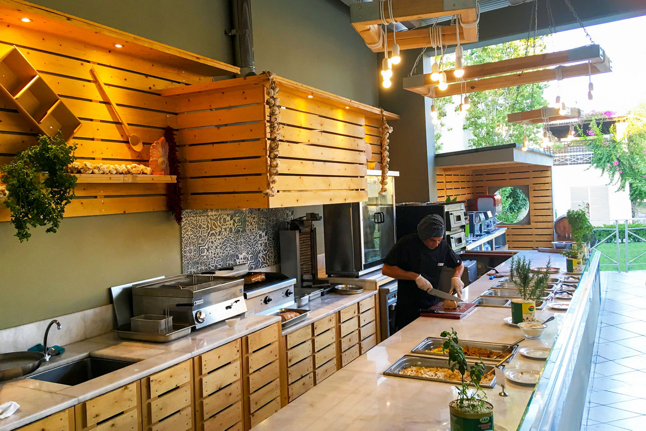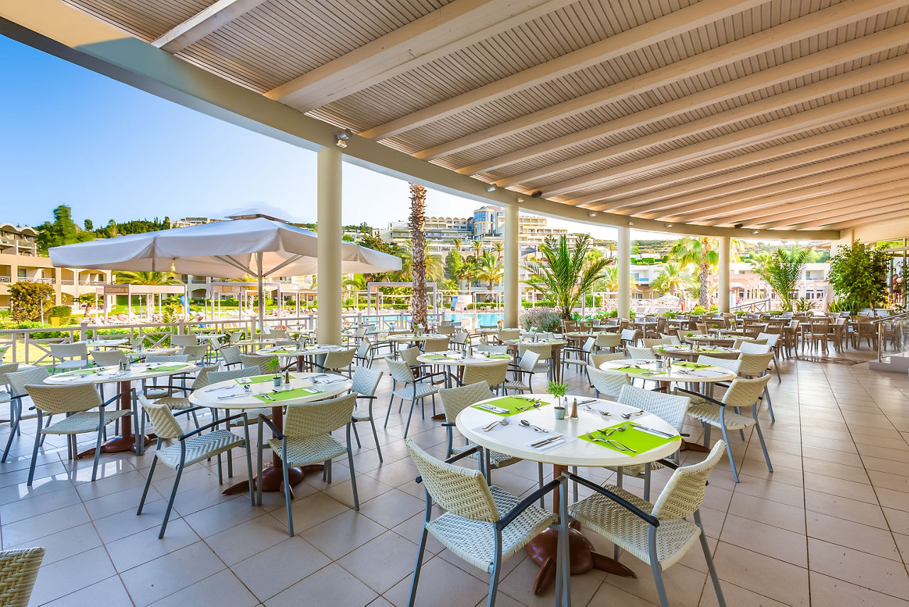 2 buffet restaurants (one with themed set menu on selected evenings ? reservation required). Option to dine at sister hotel Kipriotis Village (reservation required). 2 bars. All Inclusive guests receive buffet breakfast, lunch and dinner in the main restaurant plus snacks at selected times between meals. Local beer, wine, spirits and non-alcoholic drinks are included for a minimum of 12 hours per day.Entertainment