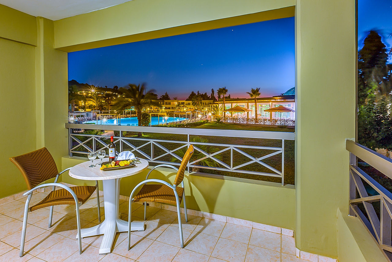 Double or Twin rooms sleep up to 3 adults or 2 adults and 1 child and have bathroom with bath or shower, air-conditioning (15/6 ? 15/9), satellite TV, fridge, hairdryer and a balcony or terrace. Superior rooms and Junior Suites are more spacious with a sitting area and include safety deposit box and a filled mini bar on arrival(refilling upon extra charge). Family rooms (2 standard double rooms inter-connected) sleep up to 4 adults or 2 adults and 2 children and Twin rooms with Side Sea View are also available.