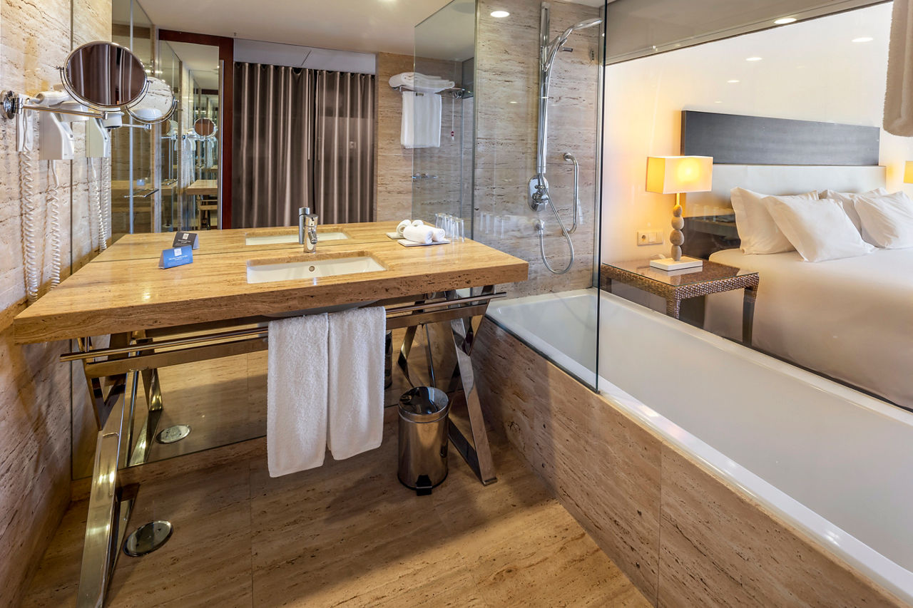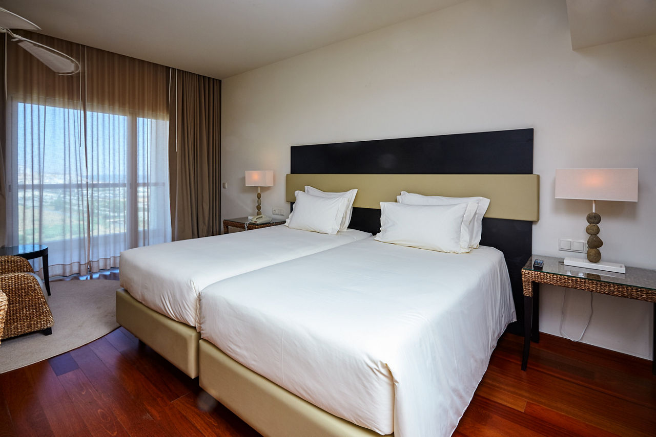 Double Superior & Double Deluxe Side Sea View rooms sleep up to 3 adults or 2 adults and 1 child and have air-conditioning, bathroom with bath or shower, satellite TV, hairdryer and Nespresso coffee machine (only in Deluxe Rooms). Superior rooms face the city of Quarteira and the Deluxe rooms face Vilamoura, both room types have side sea view. Junior Suites Beach Front rooms have full sea views and are more spacious.