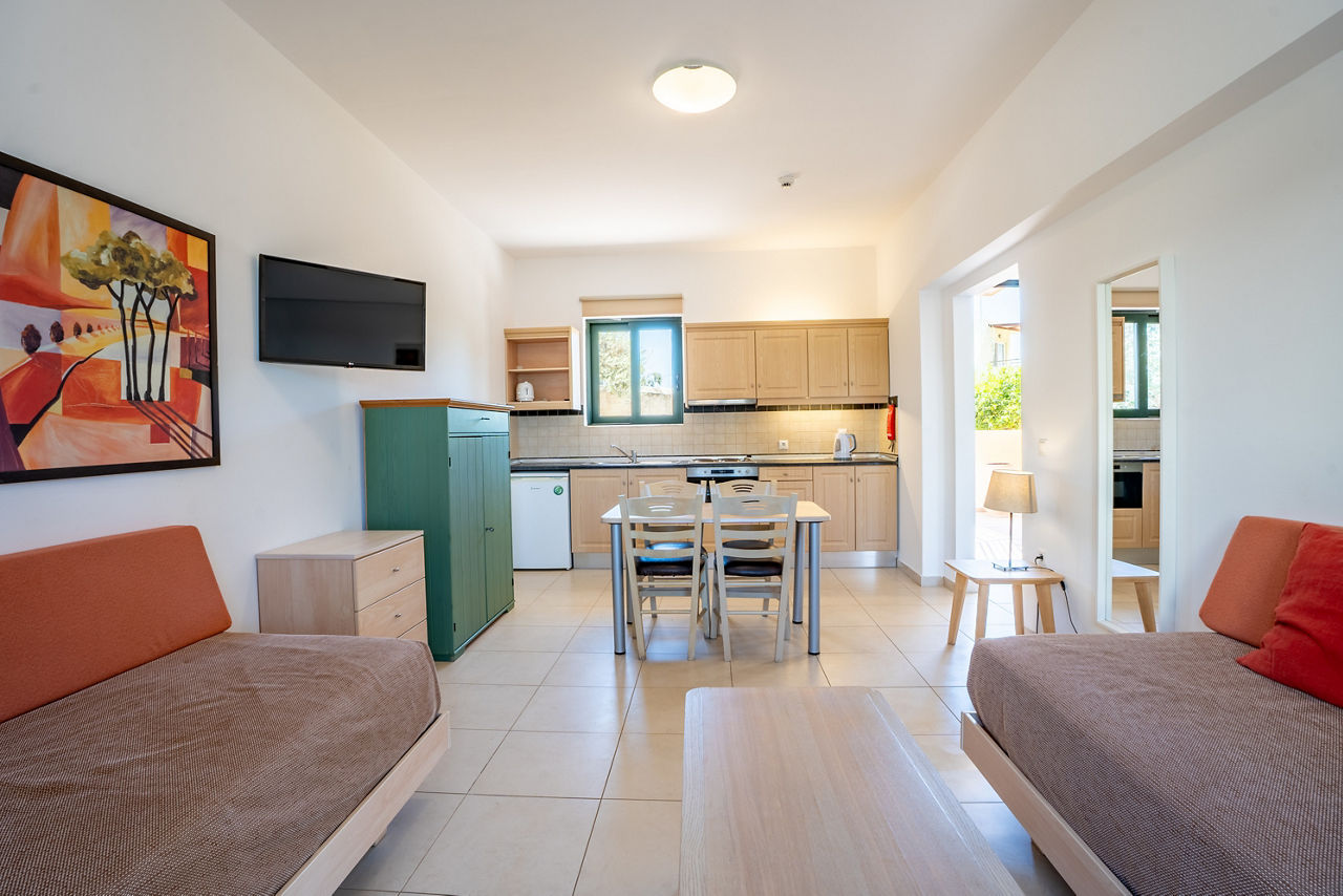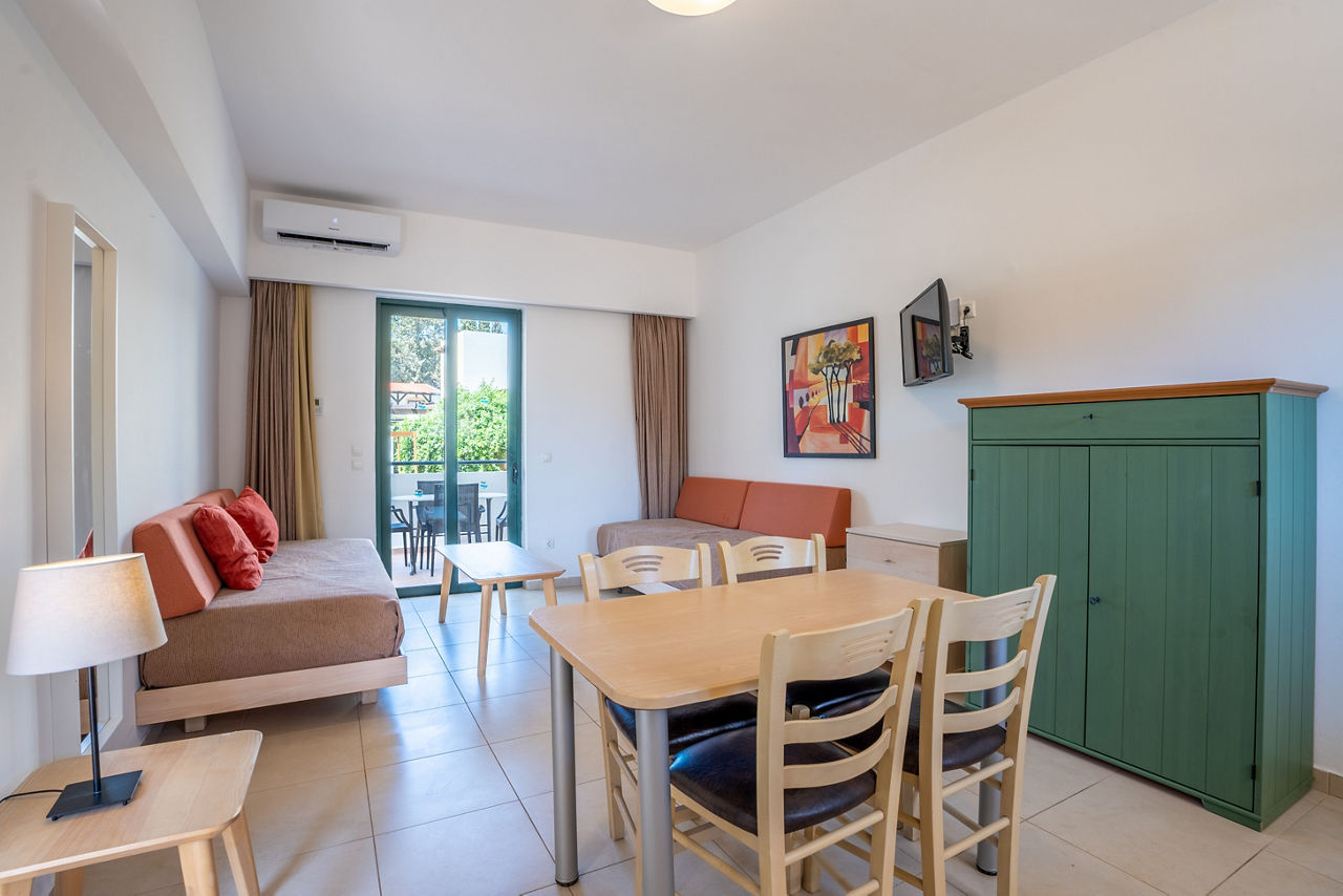 Studios sleep up to 2 adults and bathroom containing a bath with shower attachment, air conditioning*, fridge freezer, microwave, toaster, kettle and balcony or terrace. One bedroom apartments sleeping up to 4 with an oven are also available.
