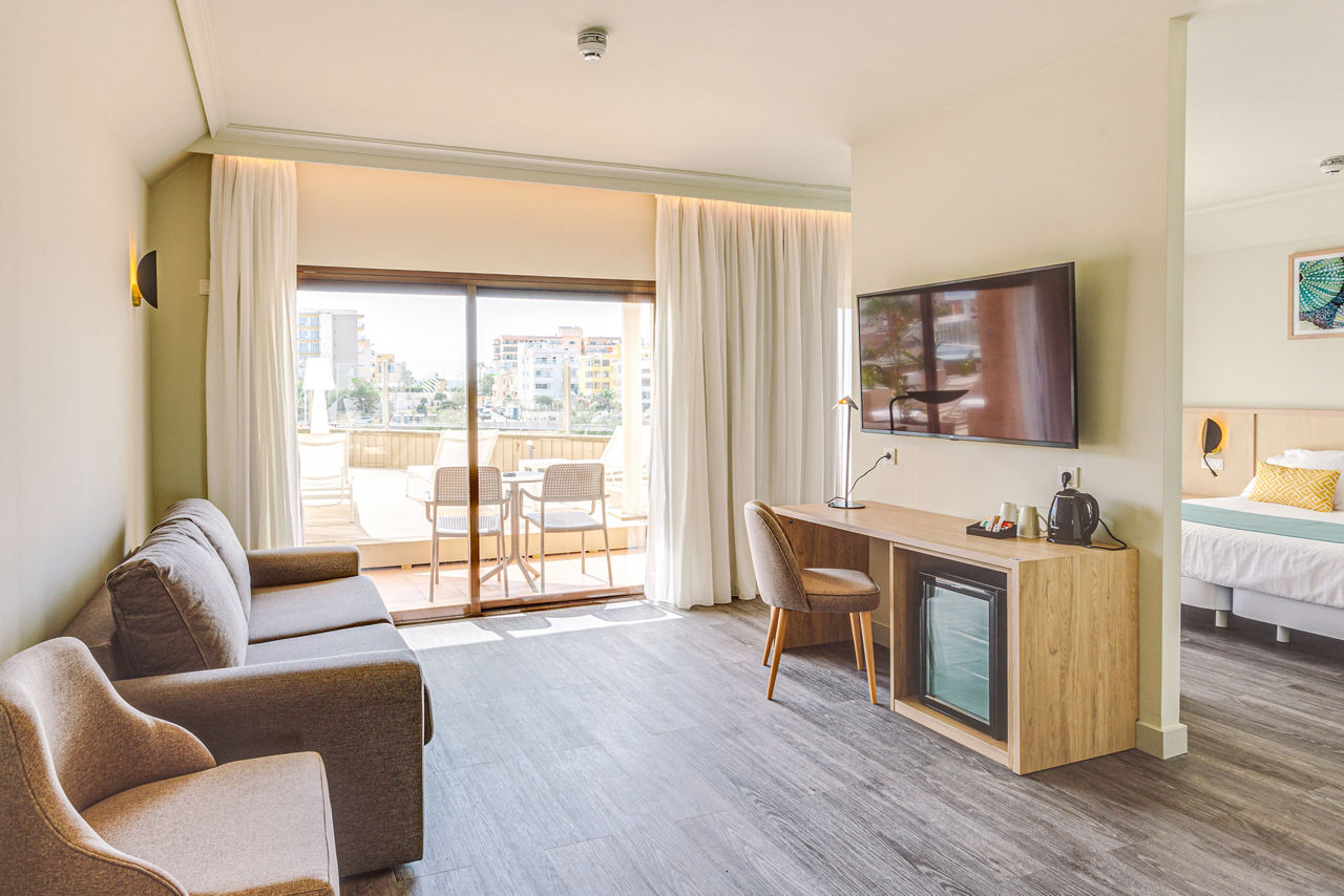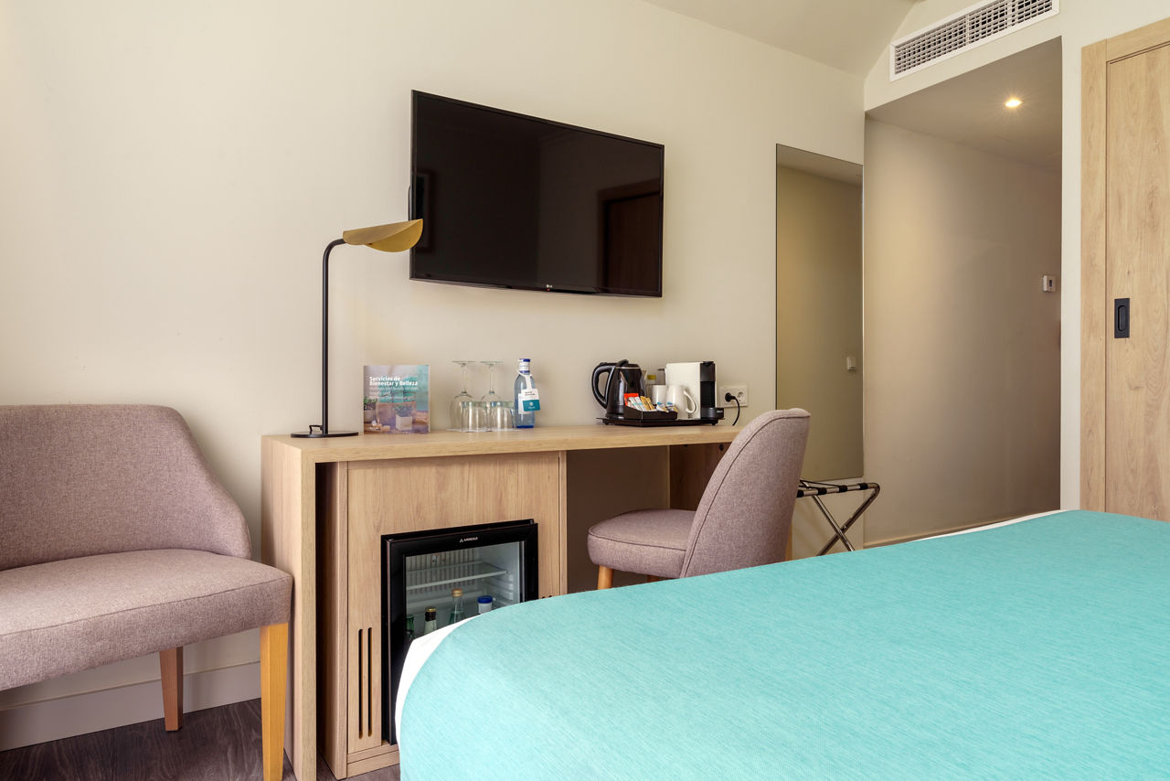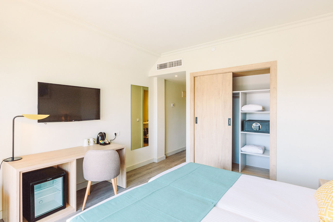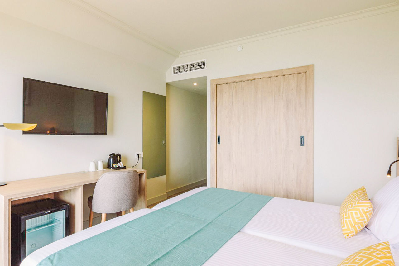 Twin rooms sleep 2 adults and have air-conditioning, flat screen satellite TV, safe, hairdryer, kettle, full bathroom and balcony. Pool or side sea view rooms, sea view rooms, single rooms and Junior suites with sea view are also available at a supplement.
