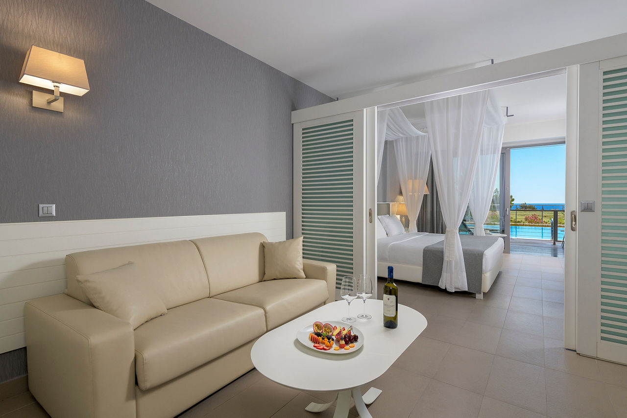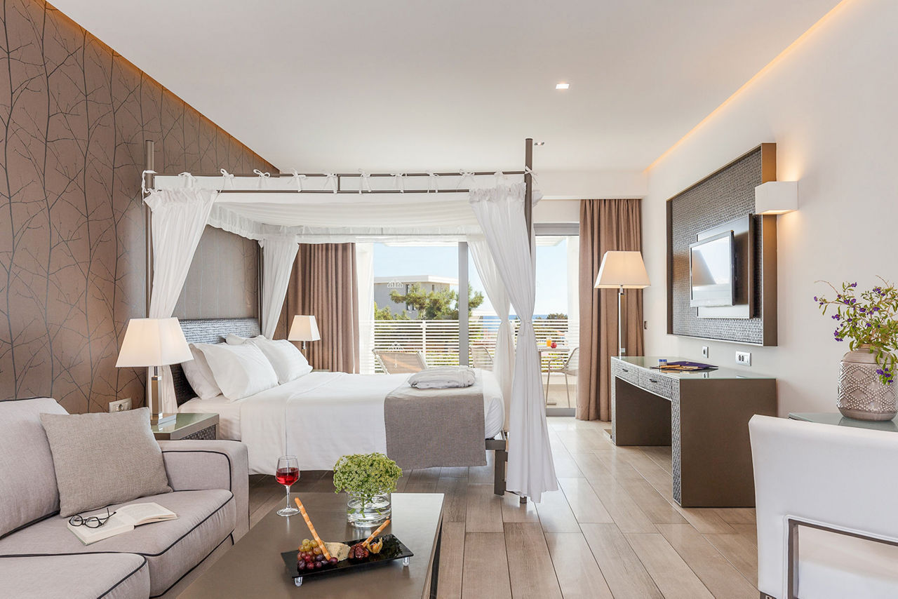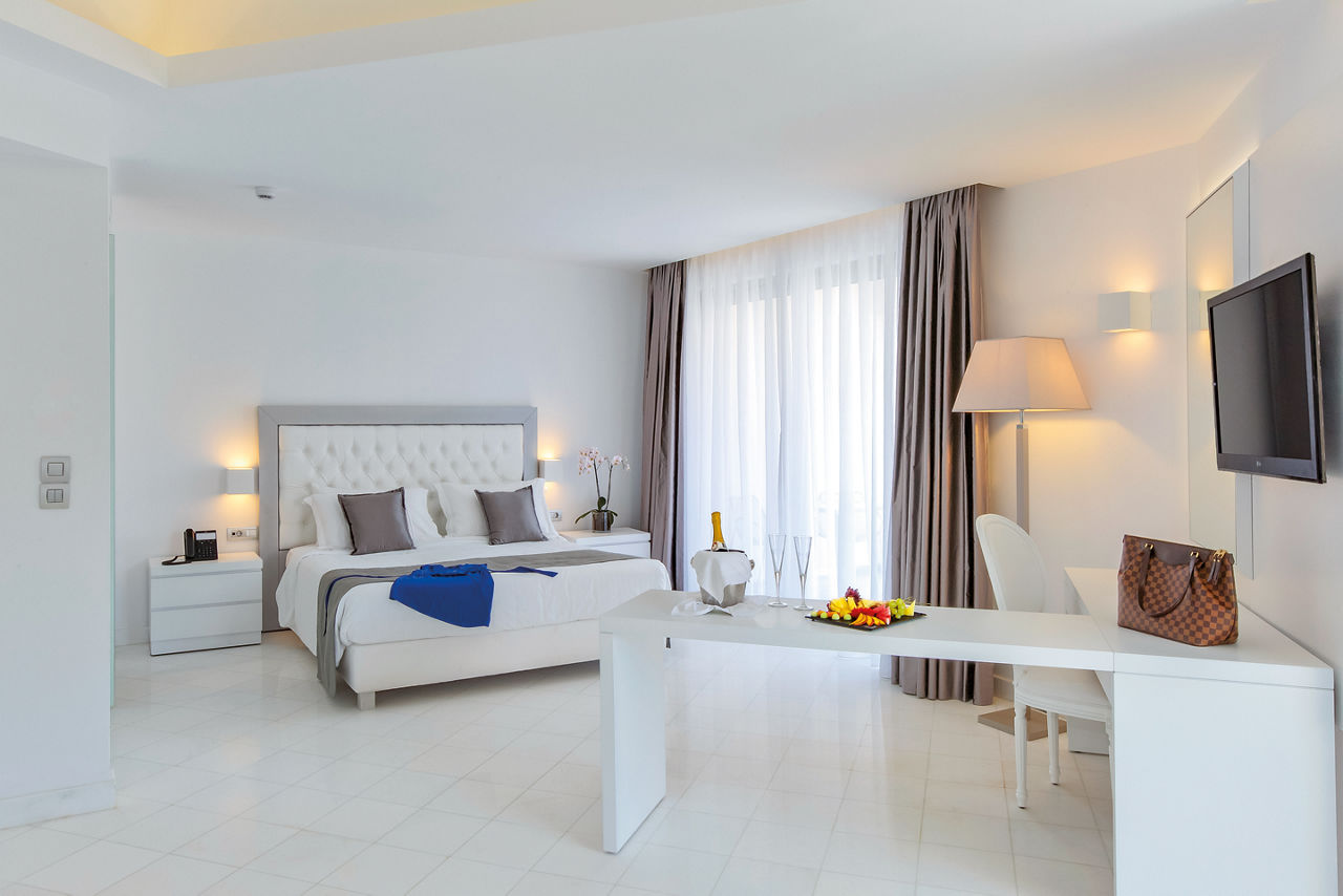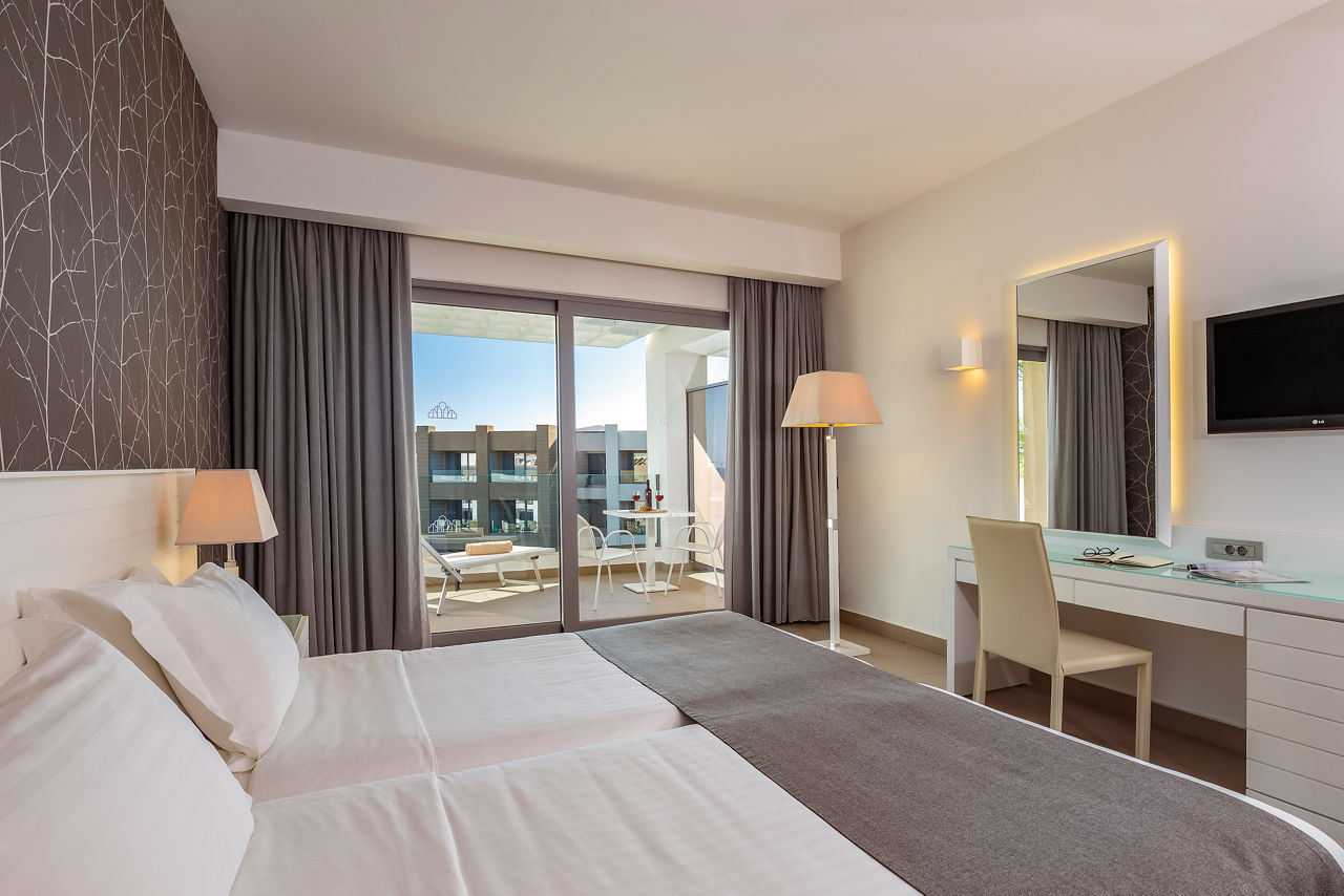 Deluxe rooms sleep up to 3 adults and have a bathroom containing a bath with shower attachment, hairdryer, satellite TV, air conditioning and balcony or terrace. Side Sea View rooms, Pool View rooms, Sea View rooms, Family rooms sleeping 3 adults and 1 child, Junior suite with Balcony, Superior Junior suite with private pool sleeping up to 3 adults and 1 child and Superior Family room with sharing pool sleeping 3 adults and 1 child are also available.