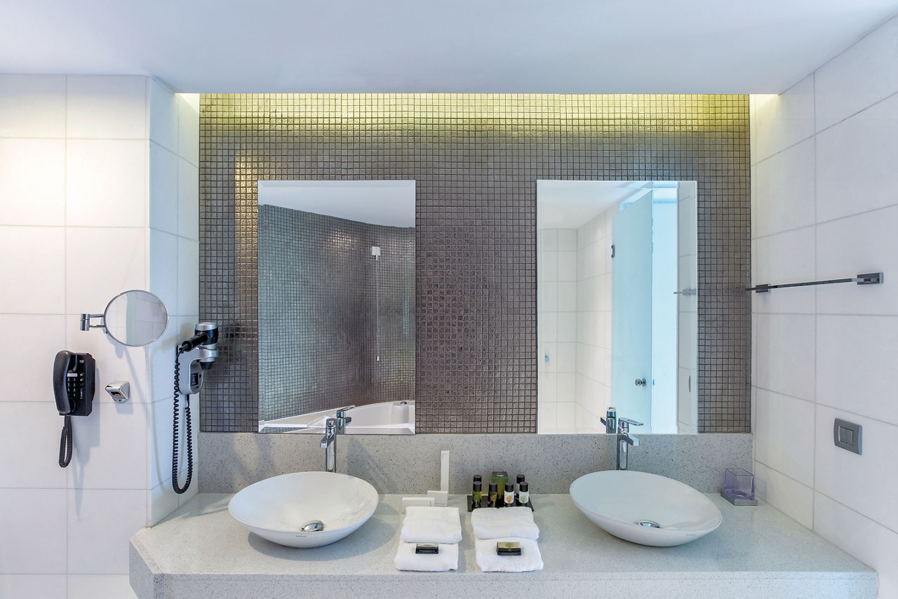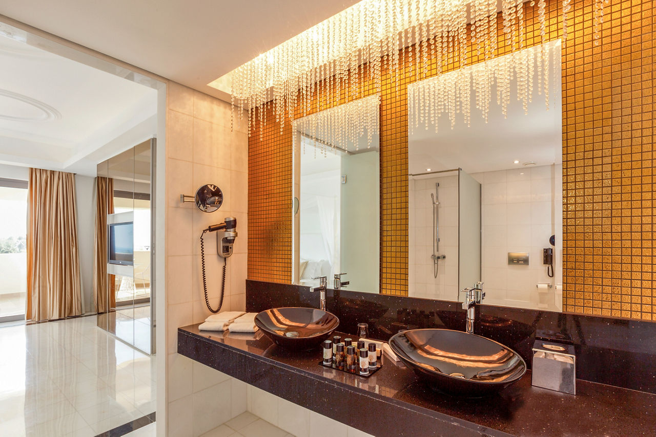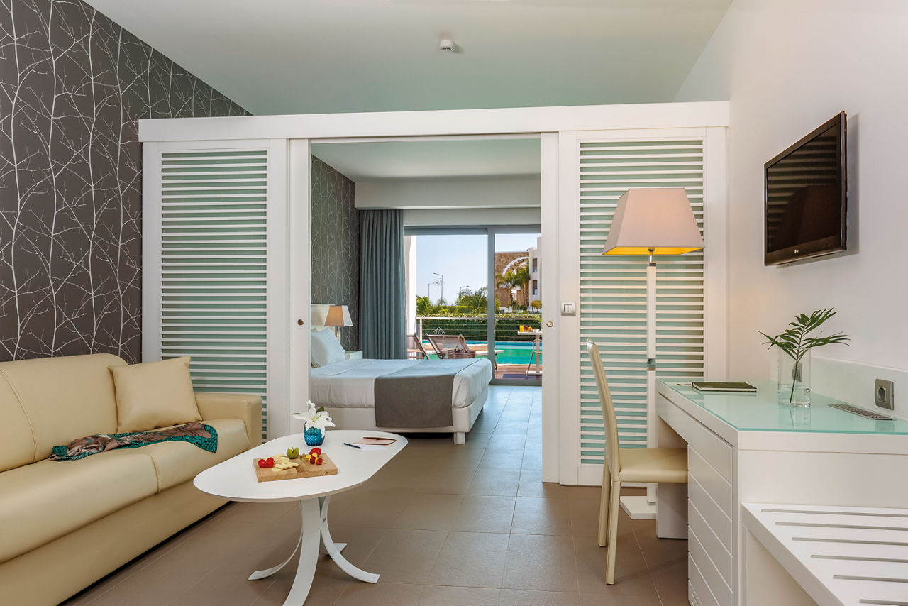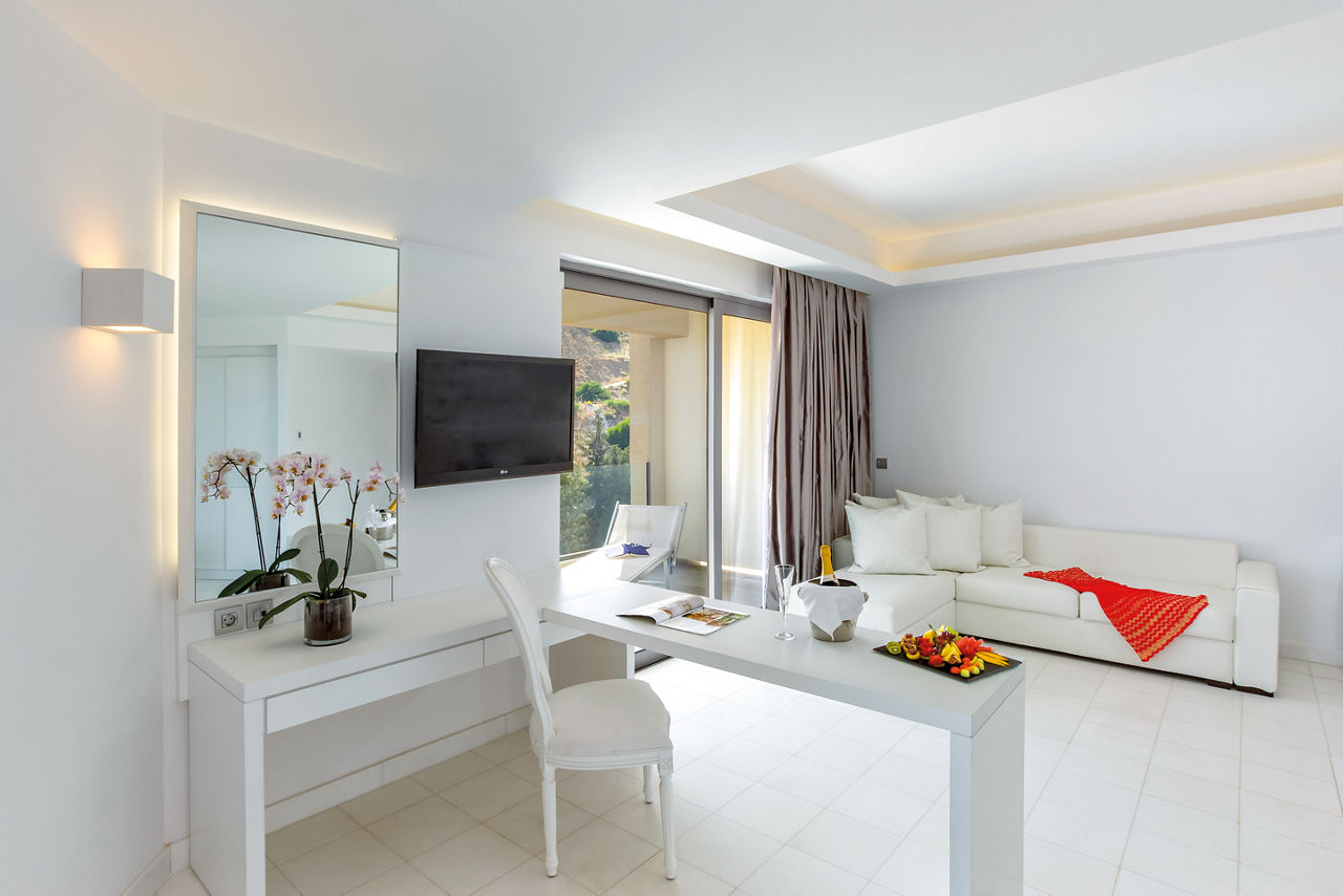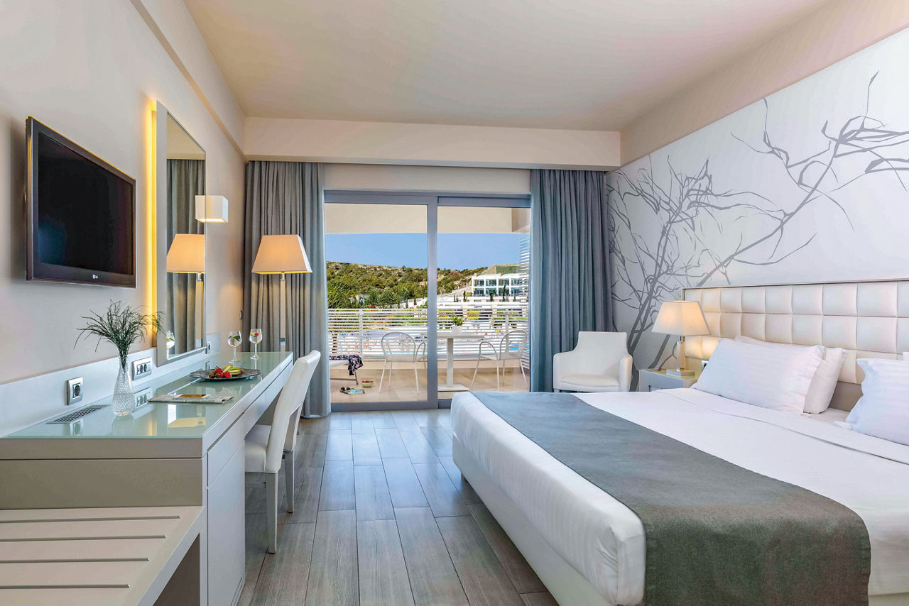 Deluxe rooms sleep up to 3 adults and have a bathroom containing a bath with shower attachment, hairdryer, satellite TV, air conditioning and balcony or terrace. Side Sea View rooms, Pool View rooms, Sea View rooms, Family rooms sleeping 3 adults and 1 child, Junior suite with Balcony, Superior Junior suite with private pool sleeping up to 3 adults and 1 child and Superior Family room with sharing pool sleeping 3 adults and 1 child are also available.
