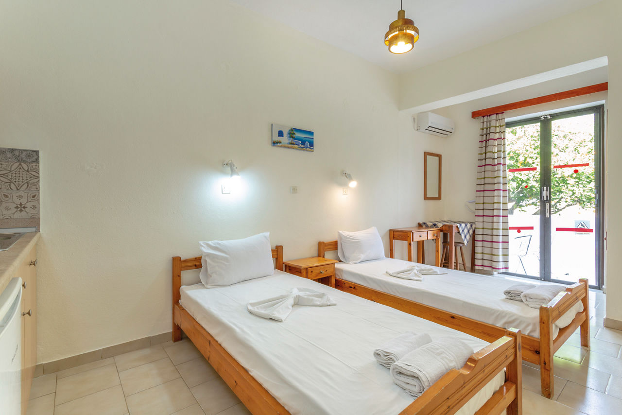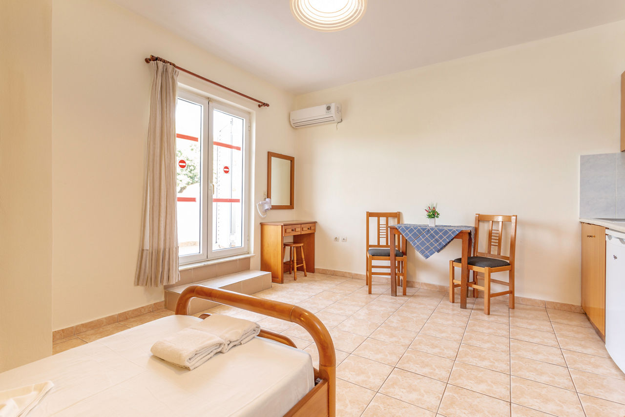 Studios - Sleep up to 3 adults and have a bathroom with shower, hairdryer, air-conditioning*, fridge and balcony or terrace. Apartments sleeping up to 4 adults are also available.